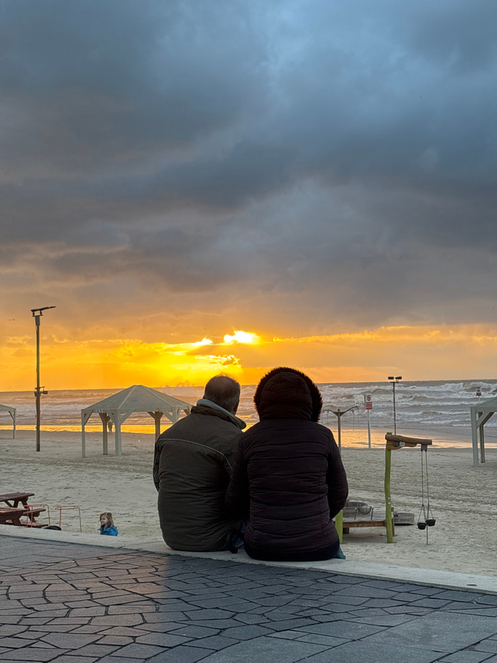 Two people sit together on a paved walkway, gazing at a vibrant sunset over the sea. Dark clouds loom on the left, contrasting with the bright orange and yellow hues reflecting off the water. Beach in…read more