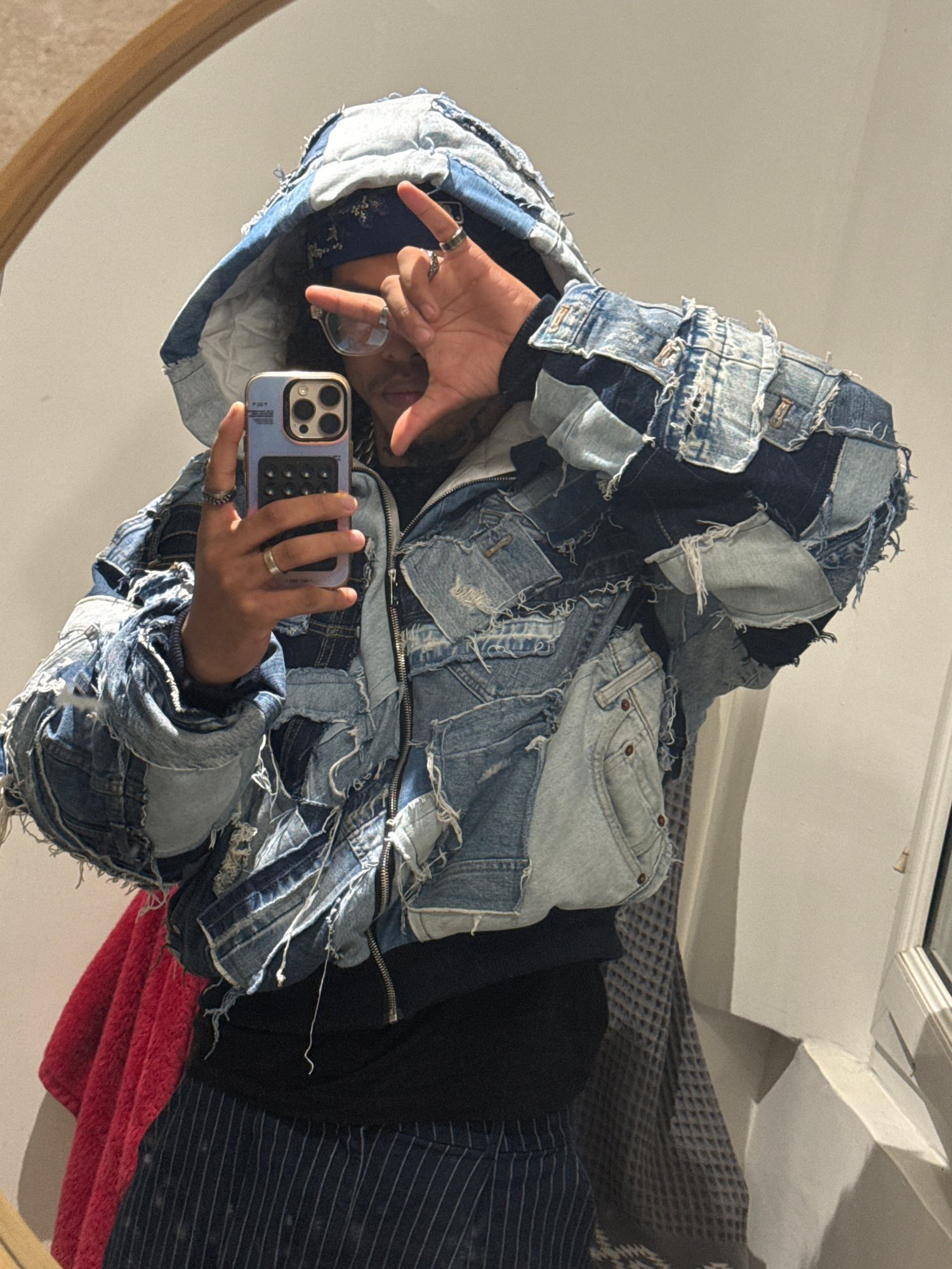 A person wearing a denim patchwork jacket and a patterned bandana is taking a selfie in a mirror. The person is holding a light blue smartphone with a black case, and their hands are positioned in a gā¦read more