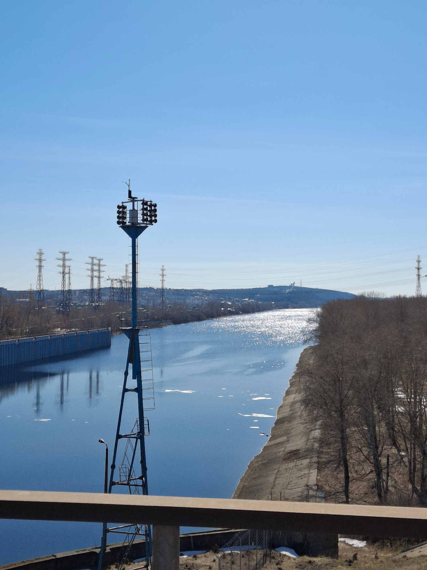 This media file captures an outdoor scene featuring a wide body of water, likely a river or large canal, under a clear, bright blue sky. The image is taken from an elevated perspective, possibly from…read more