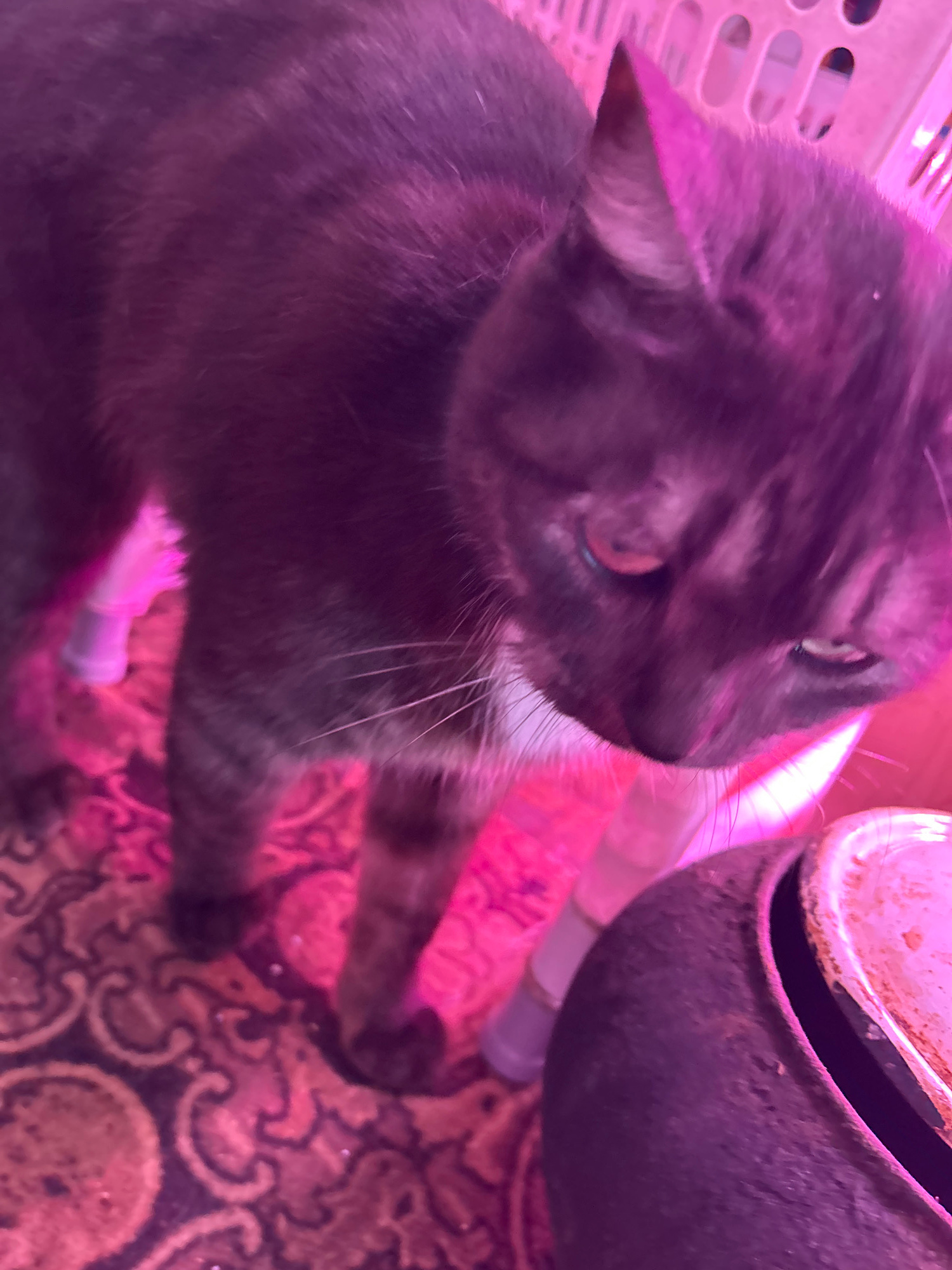 A close-up photograph shows a dark tabby cat with a white chest patch, positioned partially in the frame. The cat is turned to the right, with its face in focus and the rest of its body gradually blur…read more