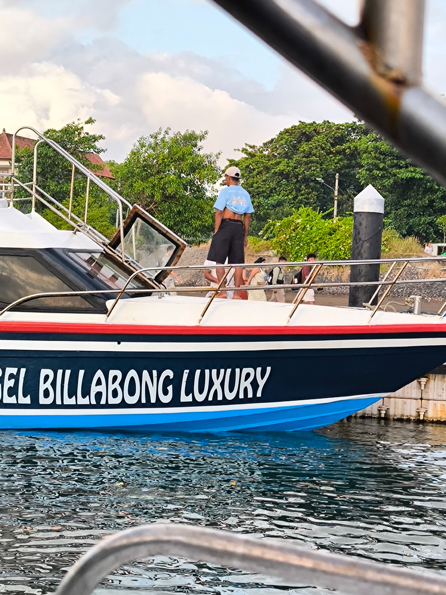 A motor yacht, prominently featuring the name "GEL BILLABONG LUXURY" in white capital letters on its dark blue hull, is depicted in a harbor in Denpasar, Indonesia. The boat has a white upper deck, a…read more