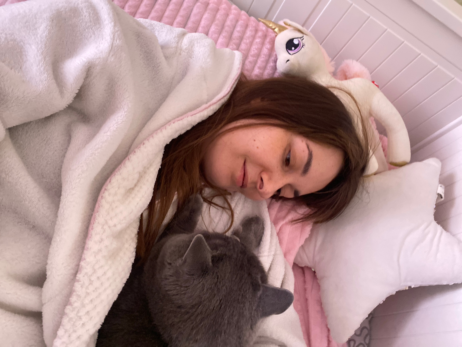 A young woman lies in a bed, partially covered by a fluffy white blanket with pink trim. Her head rests on a white star-shaped pillow, next to a white plush unicorn toy. A grey cat is positioned on he…read more
