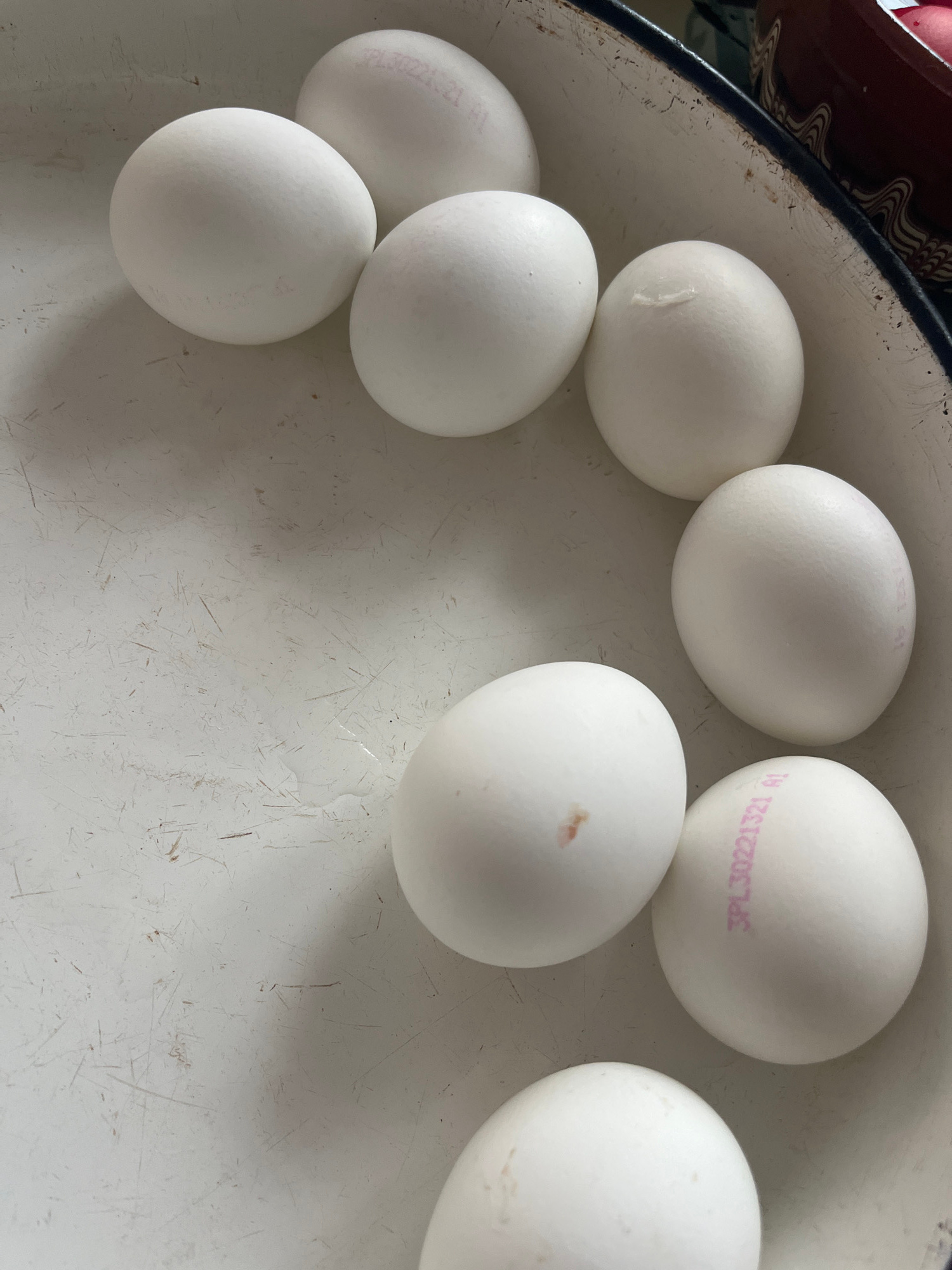 The image shows a top-down view of seven white eggs arranged in a white enamel bowl. The bowl has a dark-colored rim, possibly black or very dark blue. The background hints at other kitchenware, incluβ¦read more