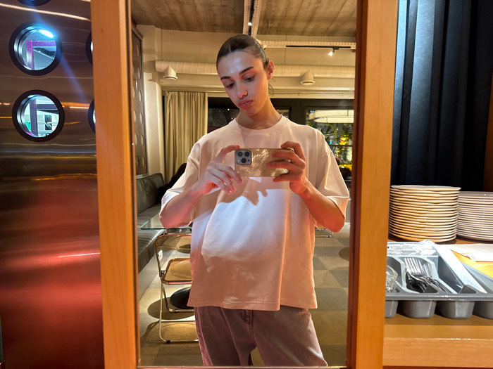 The image depicts an individual taking a mirror selfie with a smartphone in a modern interior setting, located in Yerevan, Armenia. The subject, a person with dark hair pulled back, wears a loose whit…read more