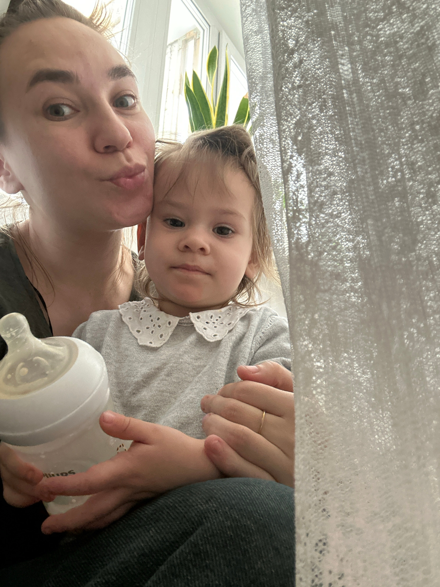 A woman holds a toddler, who is wearing a grey shirt with a lace collar, with a baby bottle partially visible in the foreground. They are indoors, with a window to the left revealing a green plant. A…read more