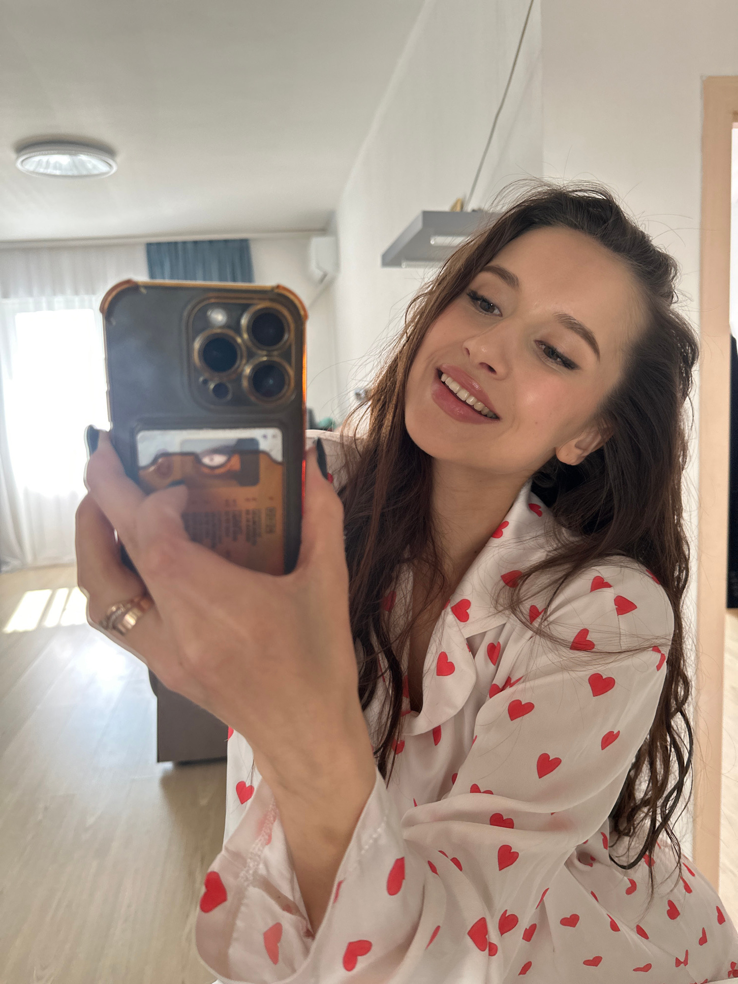 A woman is taking a selfie in what appears to be a room with light-colored walls and flooring. The woman has long brown hair and is wearing a light-colored pajama top with red hearts. She is holding a…read more