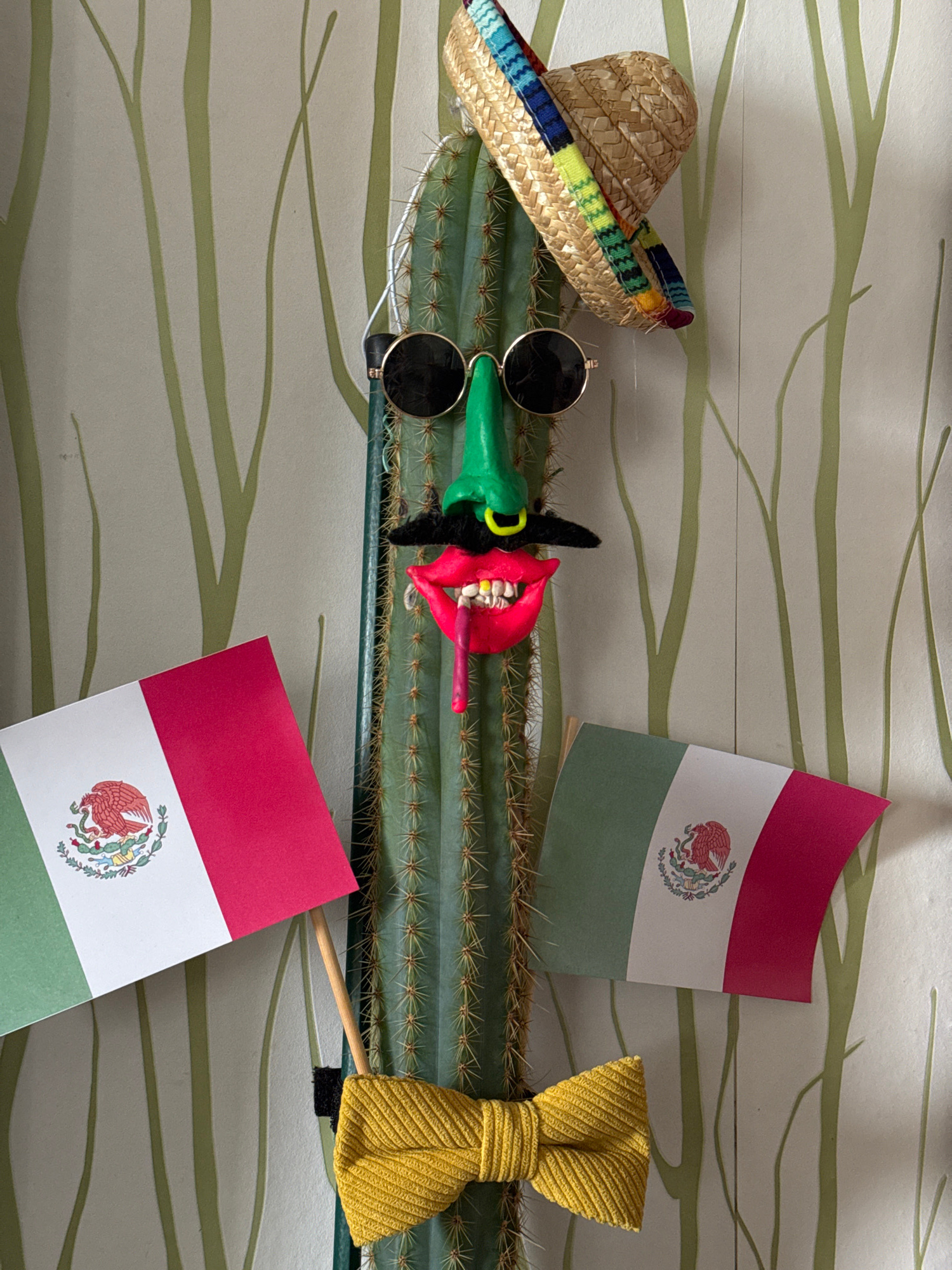 A cactus lies across a surface decorated with pale gray and light green stripes, resembling plant stems. Atop the cactus, from left to right, are a small straw sombrero with a colorful band, round sun…read more