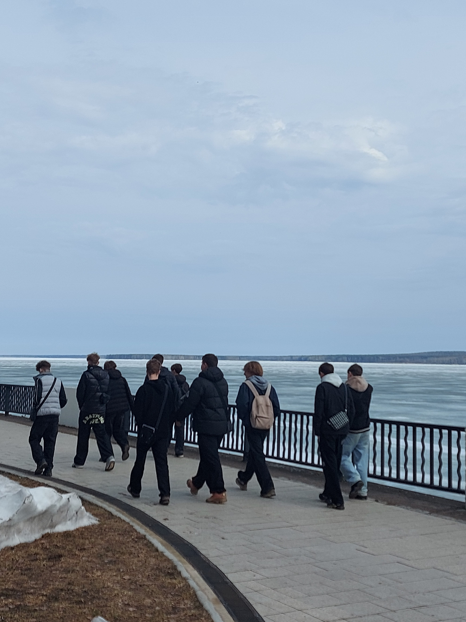 A photograph depicts a group of people standing along a promenade in Chaikovsky, Russia. They are looking over a railing towards a body of water, possibly a frozen river or lake, beneath a cloudy sky.…read more