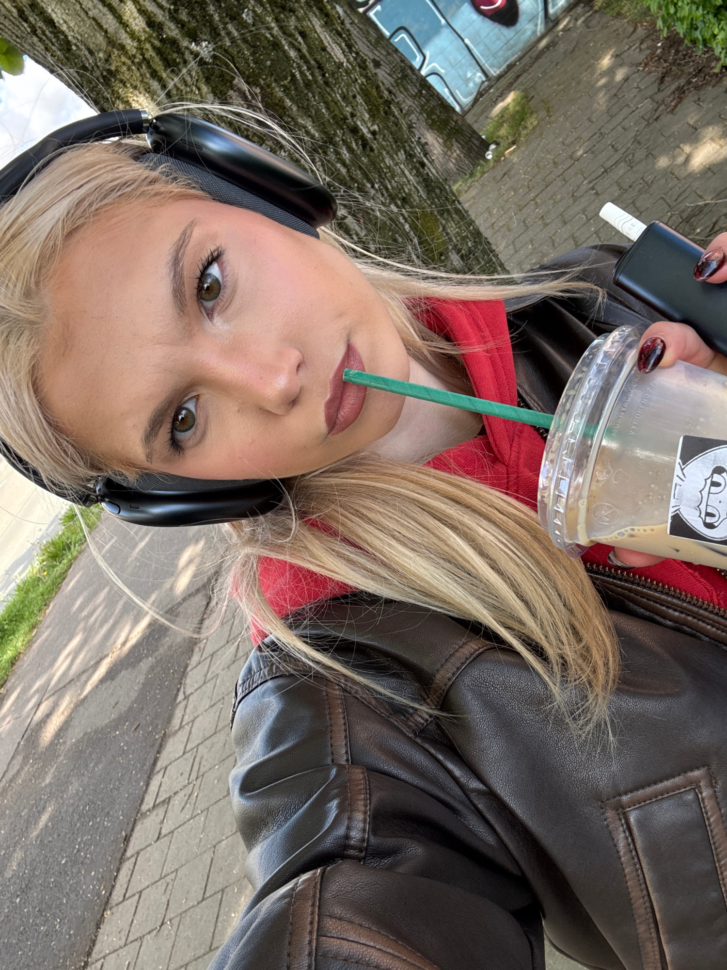 A person, likely female, is depicted in a self-portrait-style photograph. She is fair-skinned with blonde hair and is wearing black over-ear headphones. She is holding a clear plastic cup with a brown…read more