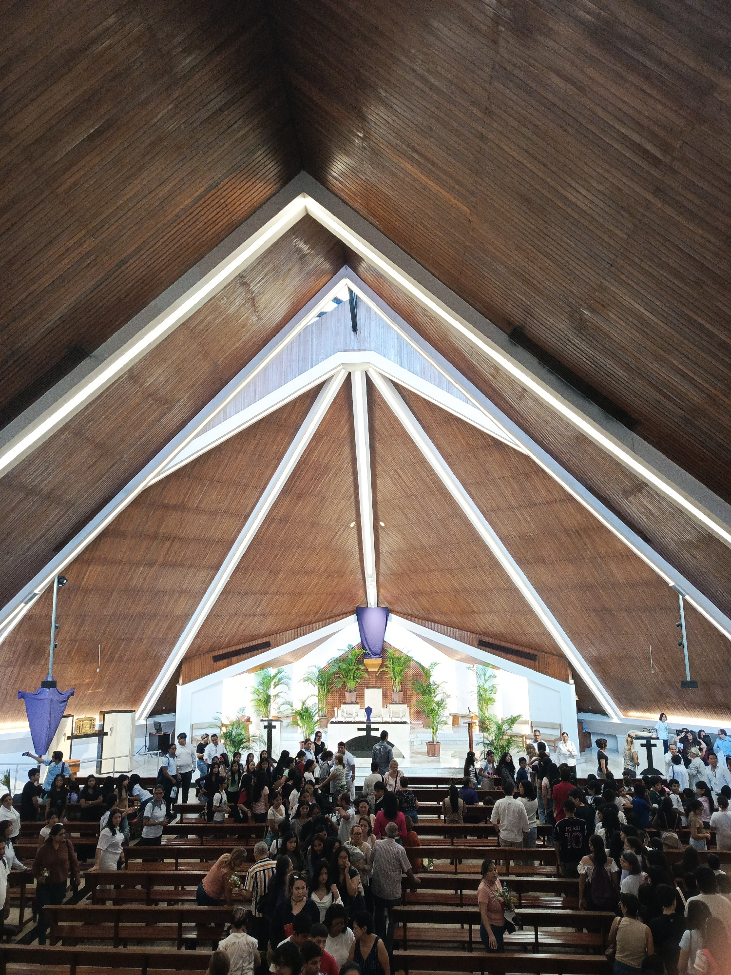 The image depicts the interior of a church. Numerous people are present, occupying rows of wooden pews. Many are standing, some are seated, and others are moving about. The architectural design featur…read more