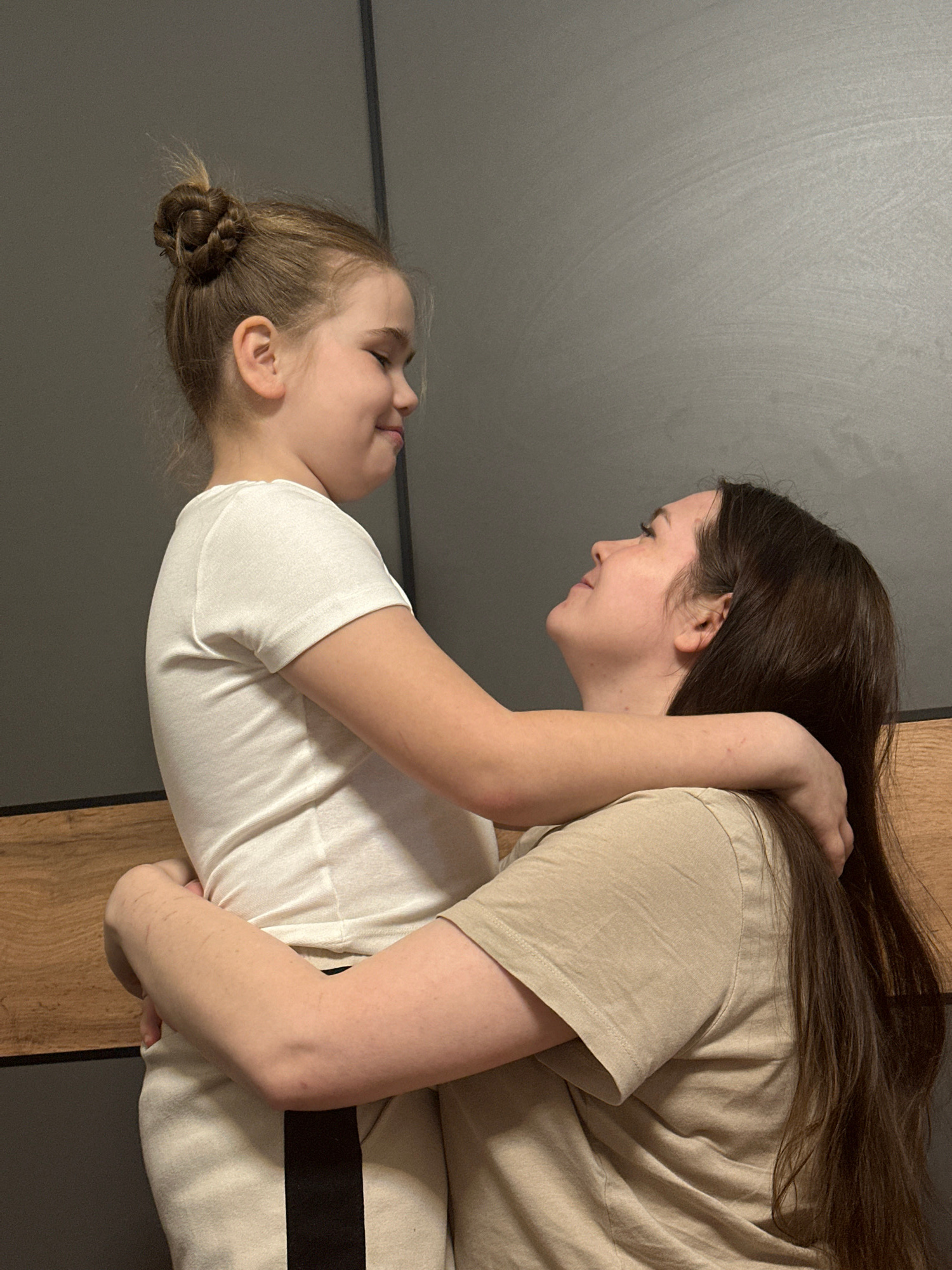 This portrait-oriented image, captured indoors, depicts two females, likely a mother and daughter or sisters, sharing an affectionate moment. The image is rotated 90 degrees clockwise from its natural…read more