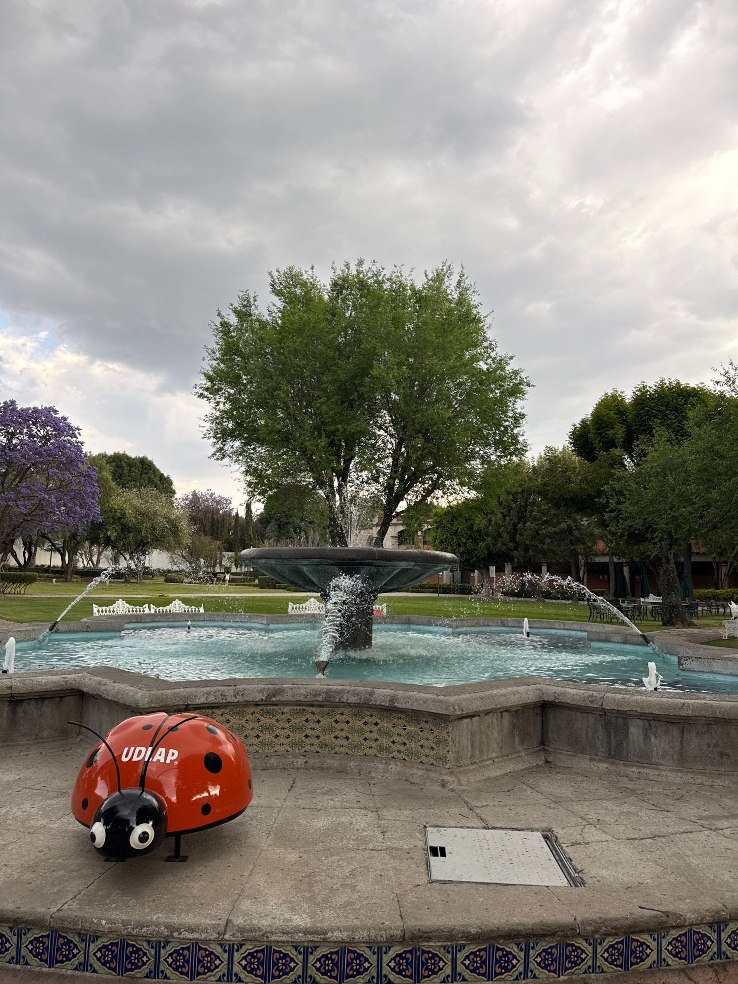 This image depicts a public park scene in San Andrés Cholula, Mexico, under an overcast sky. In the immediate foreground, an octagonal fountain with a multi-tiered bronze basin sprays water from sever…read more