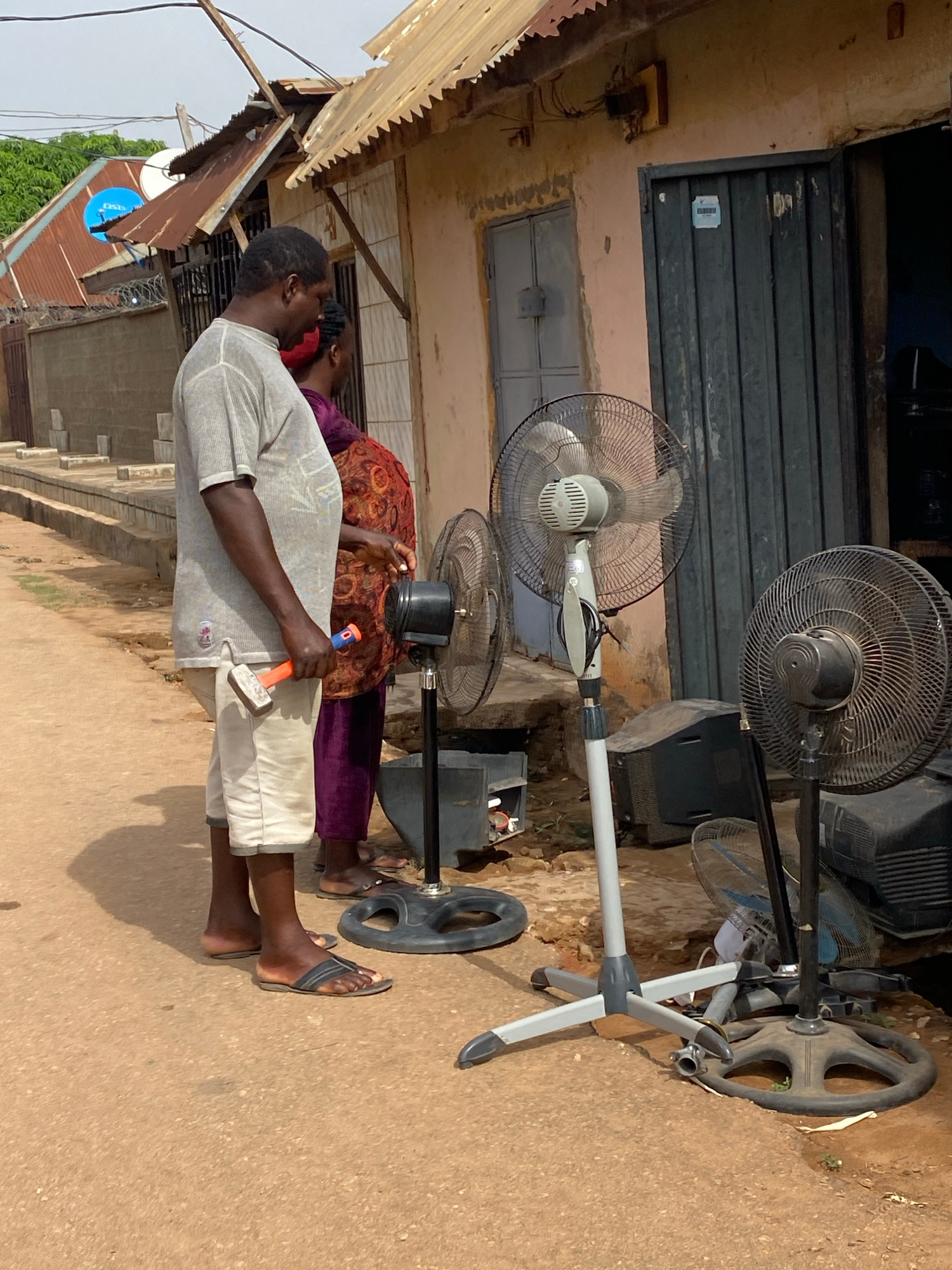 Outside a building in Narayi, Nigeria, a man in a light-colored shirt and white shorts is holding a hammer. A woman in a patterned top and purple pants stands beside him. Several electric fans, some d…read more