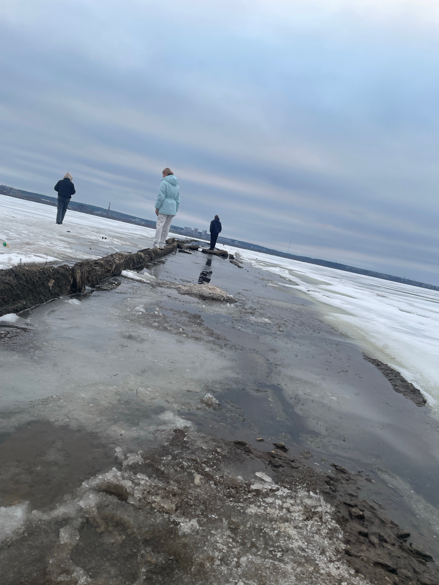 The image shows a partially frozen body of water near a city, likely Izhevsk, Russia. Three people are visible on the ice: one in a light blue jacket and light-colored pants is standing, and two other…read more