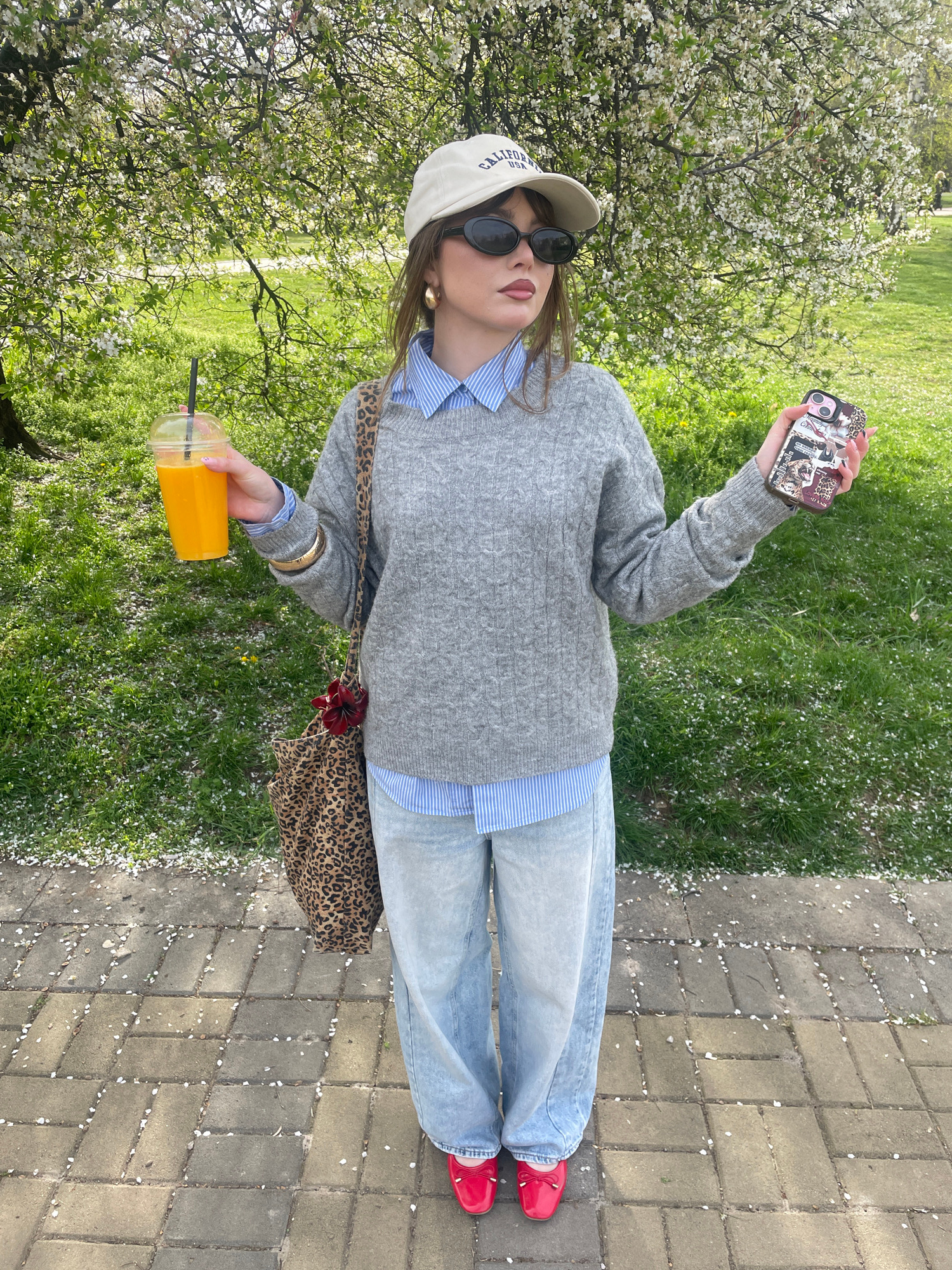 A full-body image, oriented vertically, depicts a person standing outdoors on a paved pathway. The setting is likely a park or garden in Sofia, Bulgaria, on a bright, sunny spring day. White petals, p…read more