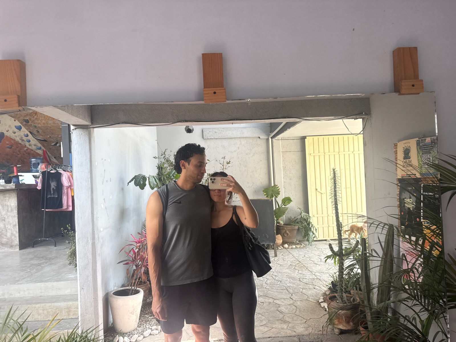 A man and a woman are standing together in front of a large mirror, taking a selfie. The man is wearing a gray tank top and dark shorts. The woman is wearing a black tank top and dark leggings, holdin…read more