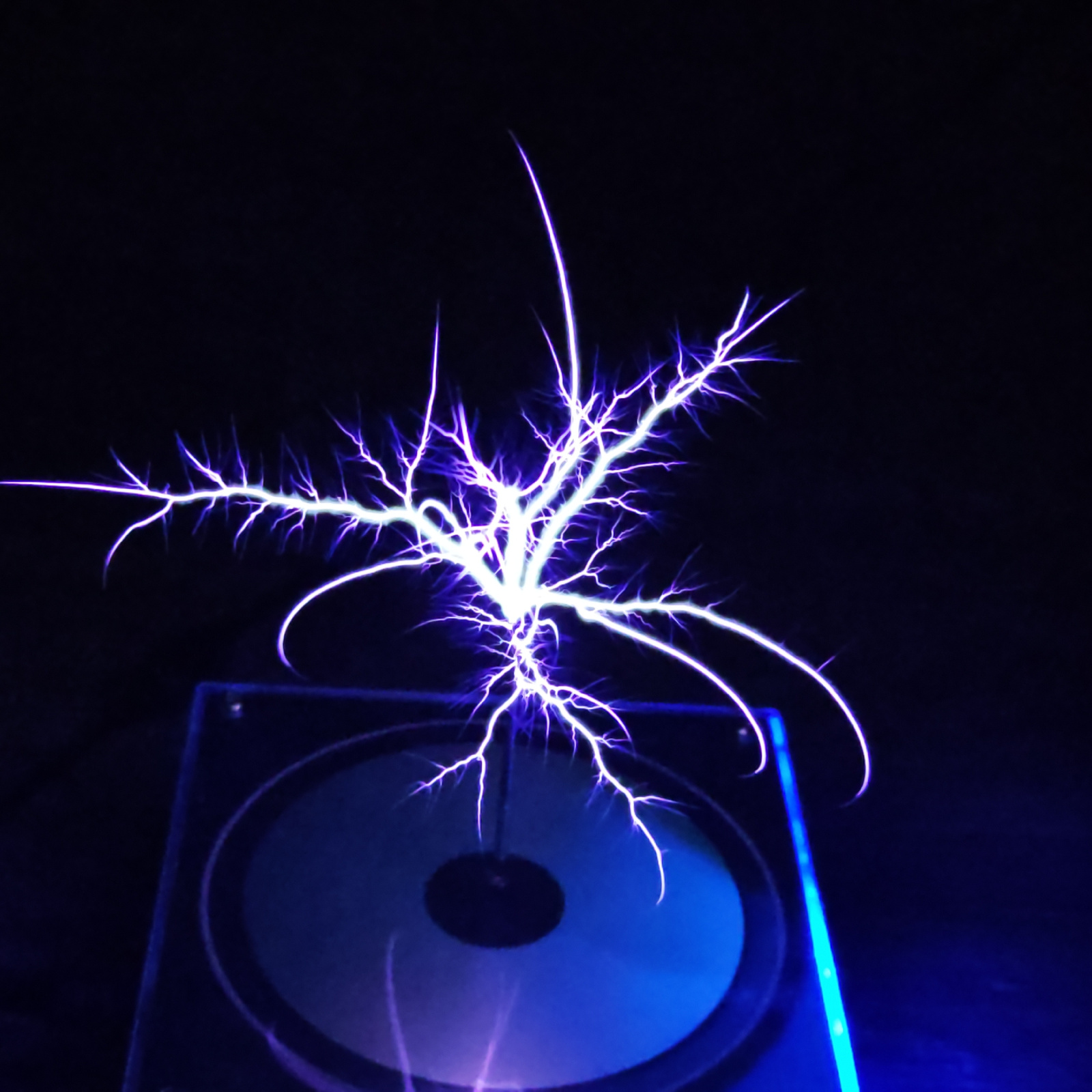 A close-up shot shows electrical discharges emanating from a device, possibly a Tesla coil. The discharges are a bright white-purple, branching out in a fractal pattern against a black background. The…read more