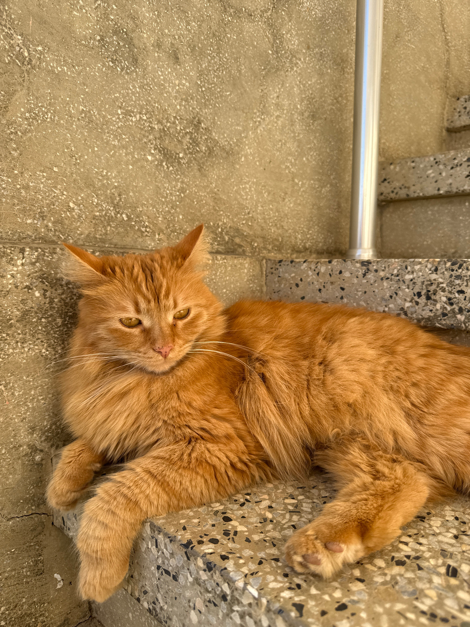 A long-haired, ginger cat is lying on its side on a speckled, grey concrete floor. The cat's head is in the lower left of the frame, and the body extends diagonally toward the upper right. A chrome ba…read more