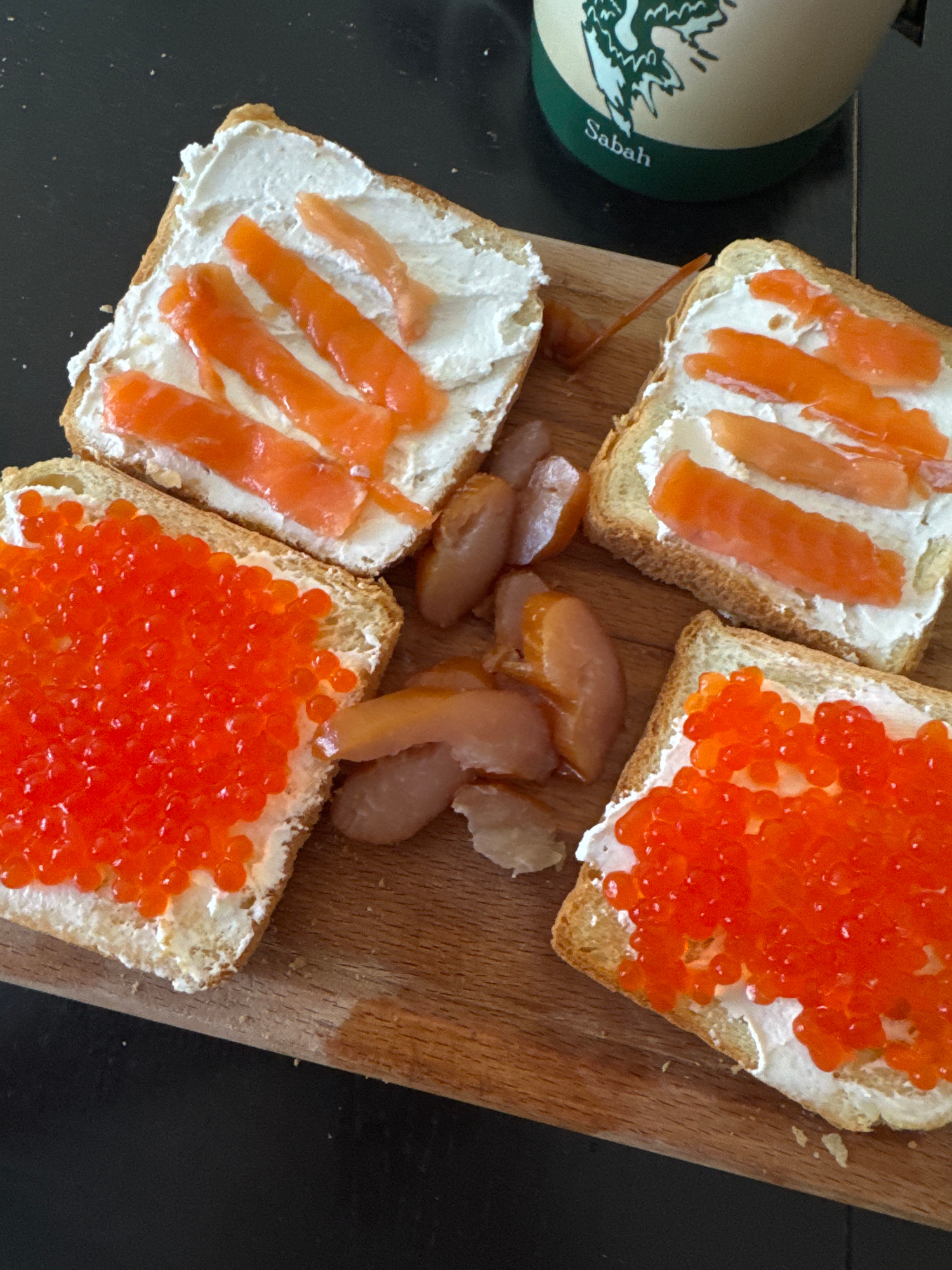 The image shows a wooden cutting board on a black surface. The board holds four square pieces of toasted bread with cream cheese spread. Two slices are topped with strips of salmon, while the other tw…read more