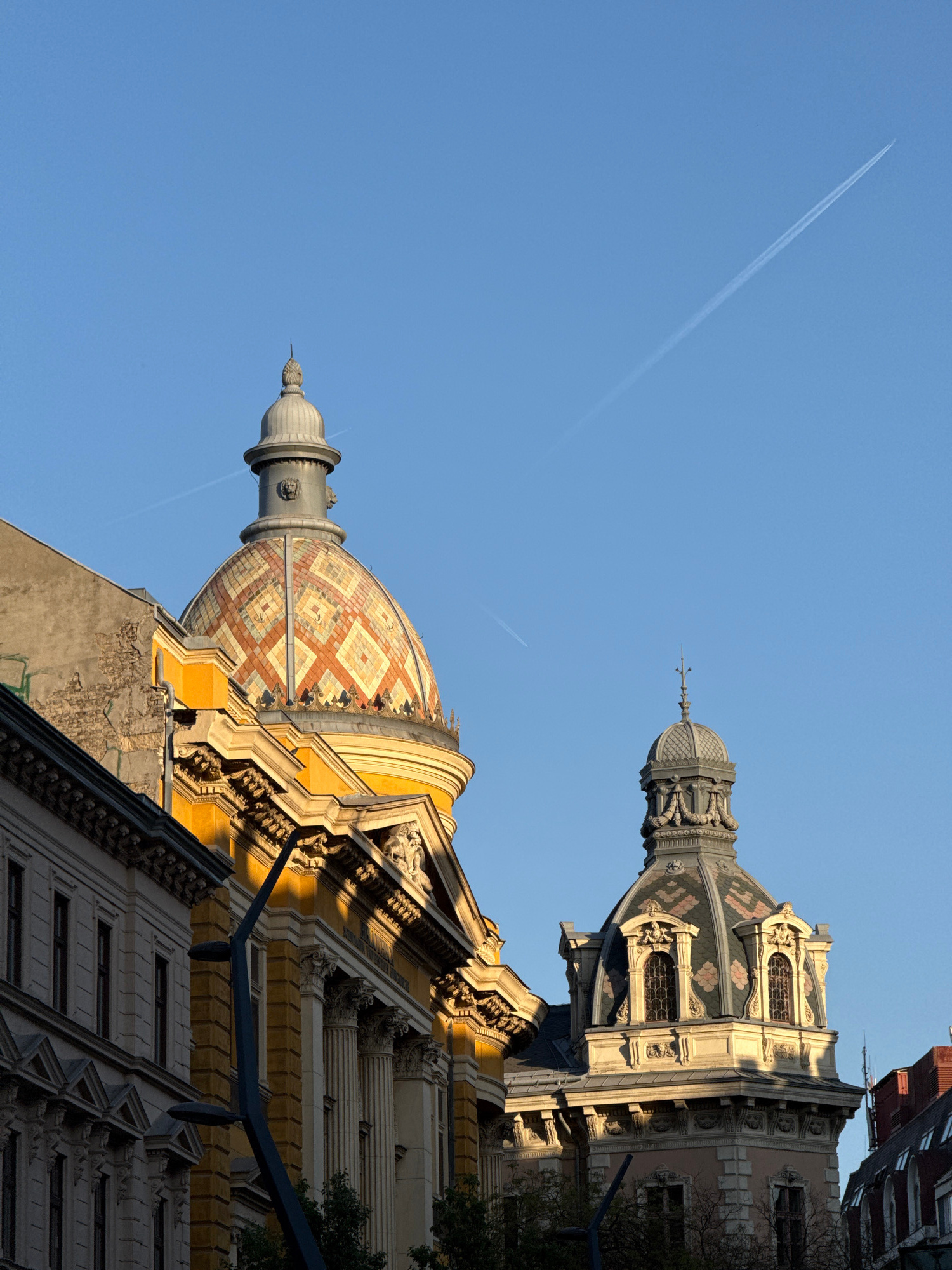 Two ornate building domes and the facade are captured from a low-angle perspective against a clear blue sky with contrails from an aircraft. The lower dome features a colorful tiled pattern, while the…read more