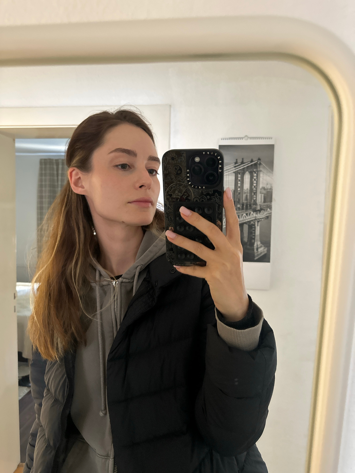 A woman is taking a selfie in a mirror. She is wearing a black puffer jacket over a grey hooded sweatshirt. The mirror has a gold frame. Behind her in the reflection, there is a black and white print…read more
