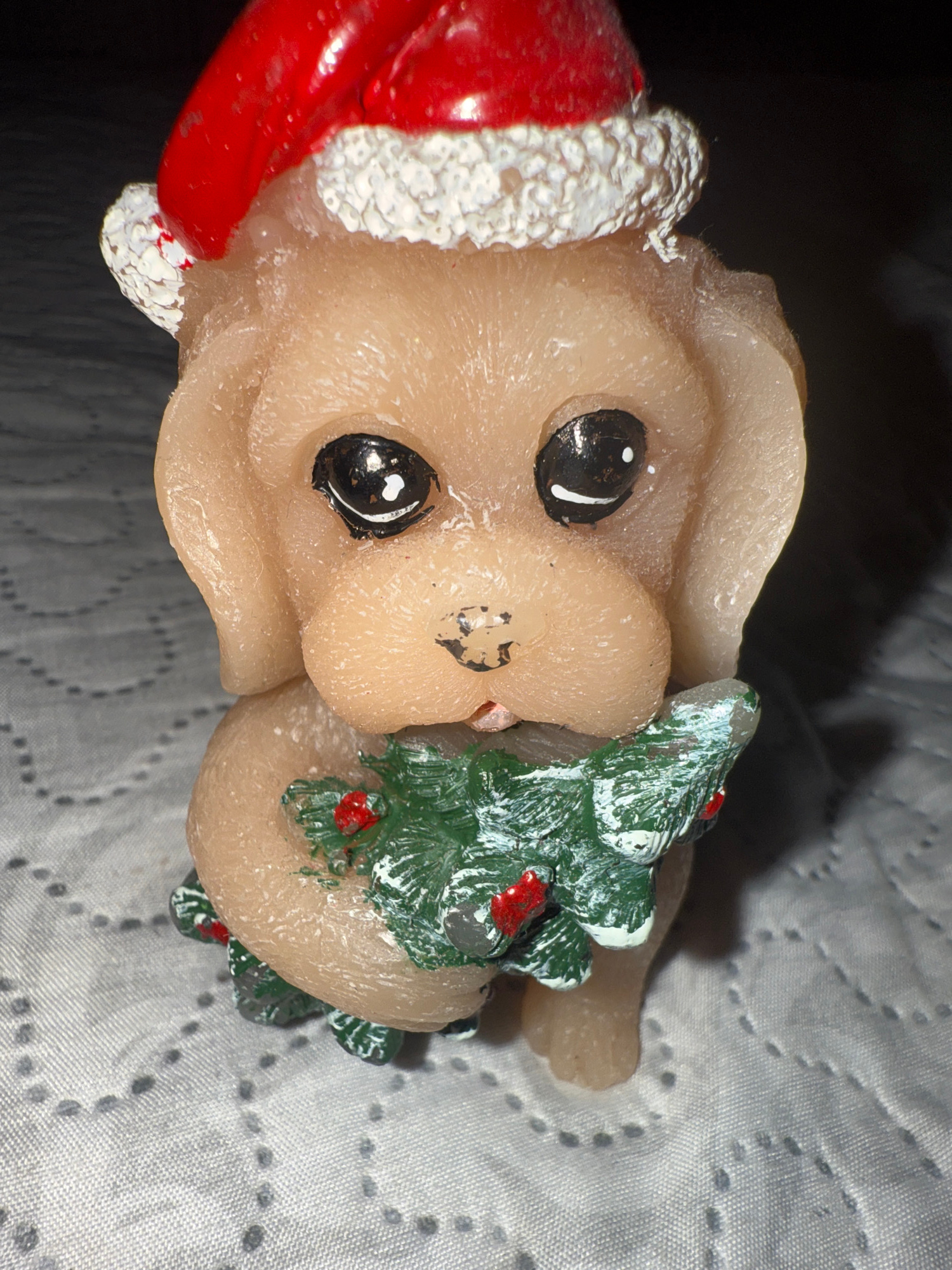 The image presents a close-up view of a festive Christmas figurine, likely a decorative item or candle, positioned diagonally on a light-colored, patterned fabric surface. The central subject is an an…read more