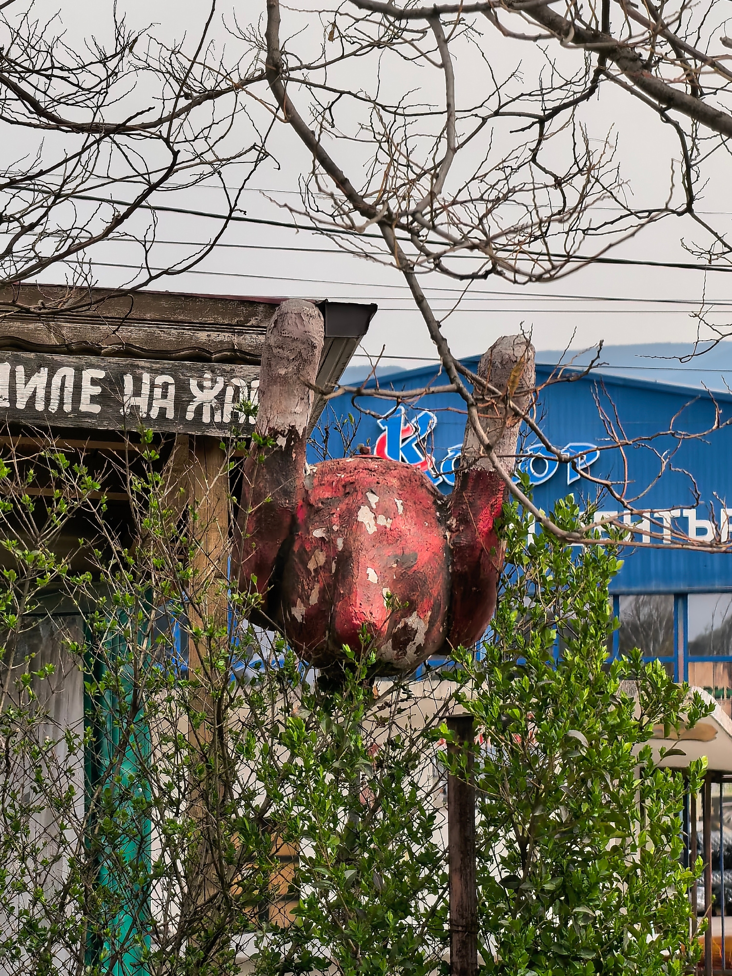 Here is a description of the image: The image shows a weathered, red and gray object that resembles a large cherry or berry, mounted on what appears to be a pole or support, partially obscured by gre…read more
