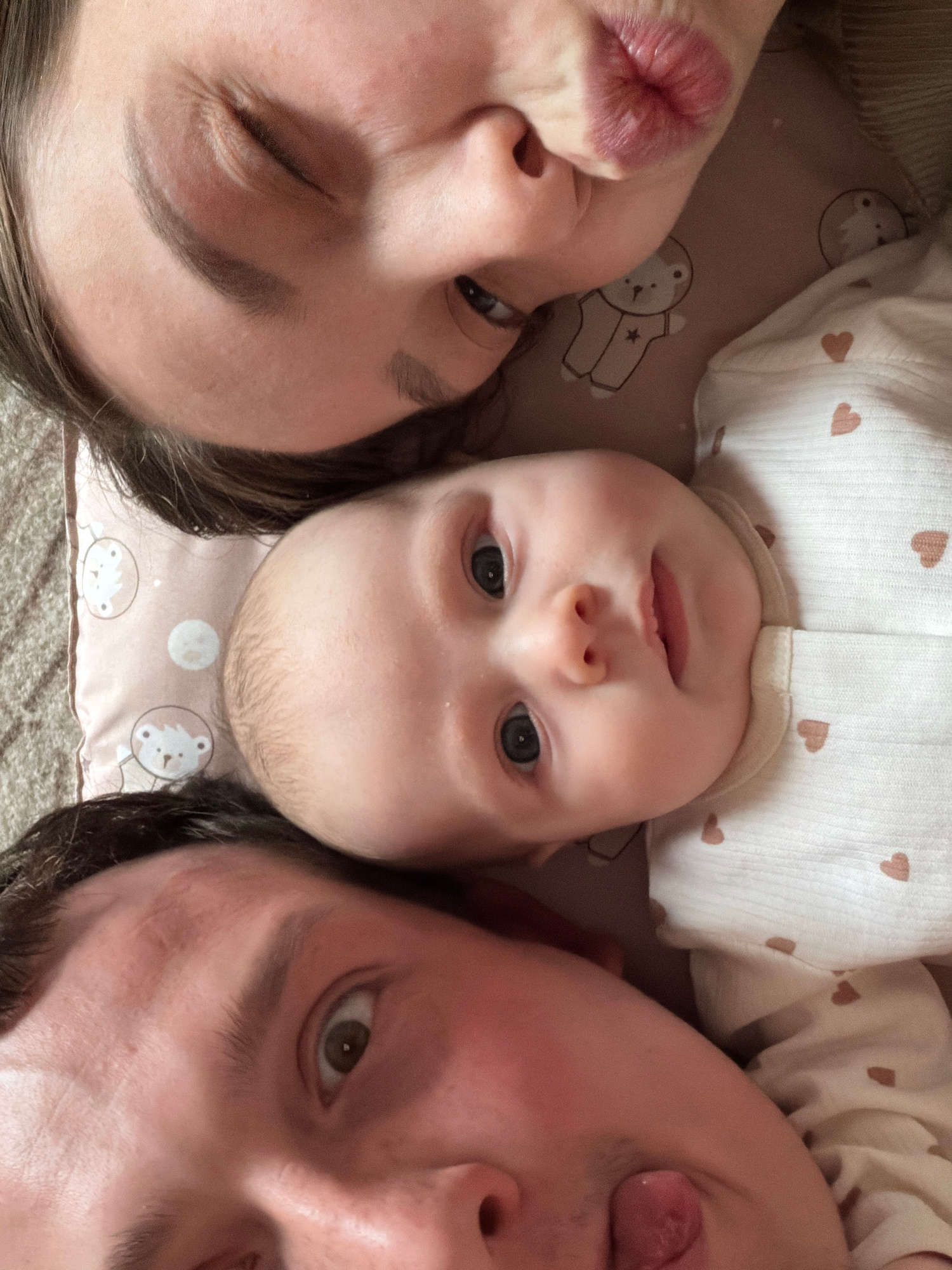 A close-up, top-down photograph depicts a baby lying between two adults. The baby is centered, with a white outfit patterned with small brown hearts. The woman on the left is puckering her lips toward…read more