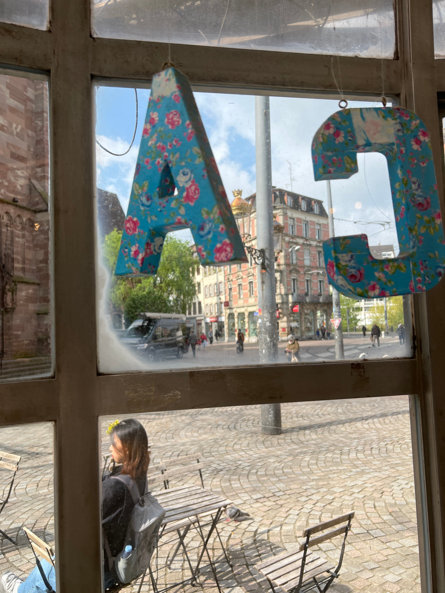 The image shows a view from inside a building looking out through a grimy window. Two floral-patterned, blue letters, 'CA', are hanging inside the window, partially obscuring the view. Outside, refle…read more