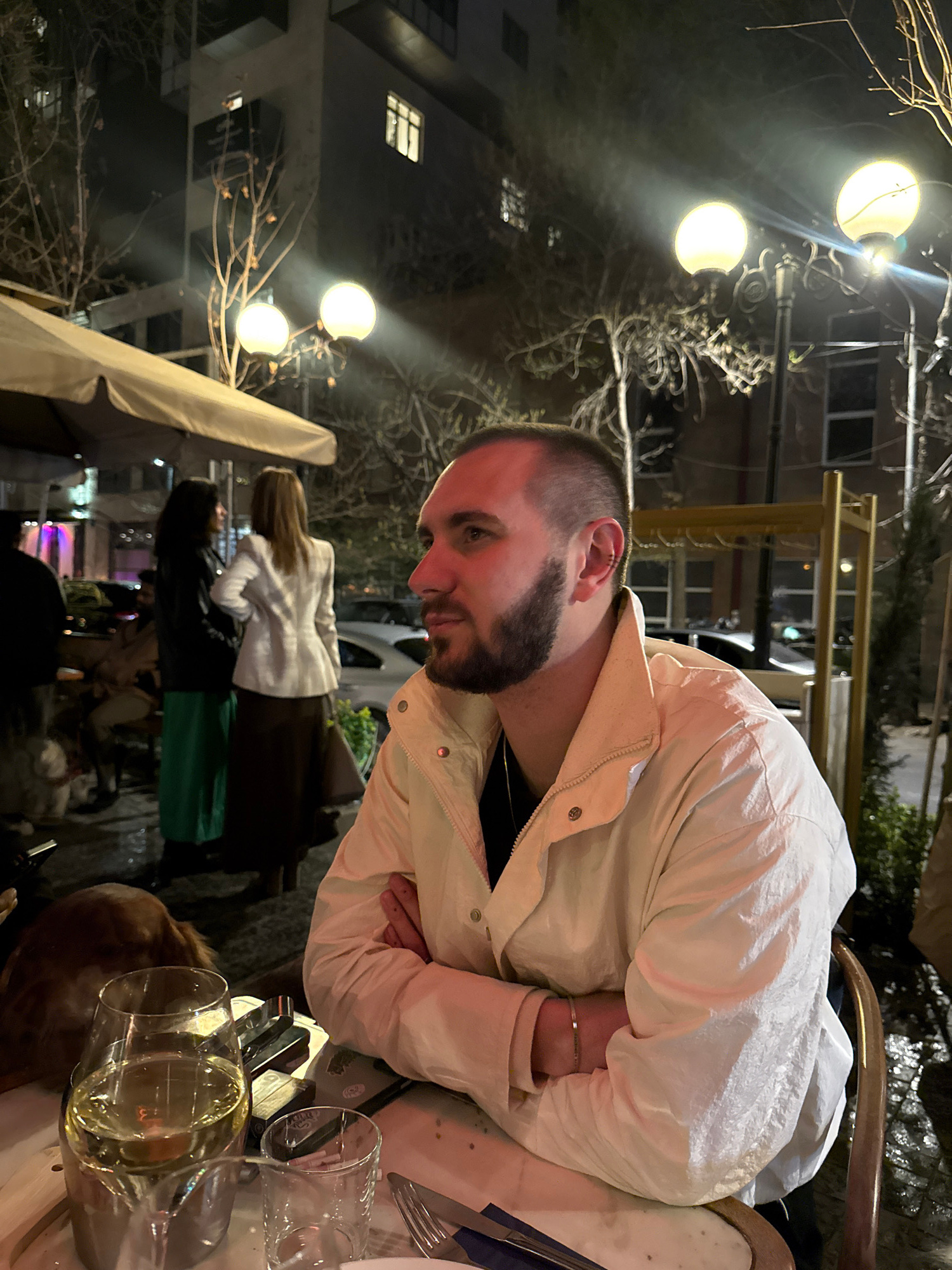 The image shows a man with a beard and a light-colored jacket sitting at an outdoor table at night. He is looking down at the table. There are several wine glasses on the table. In the background, the…read more