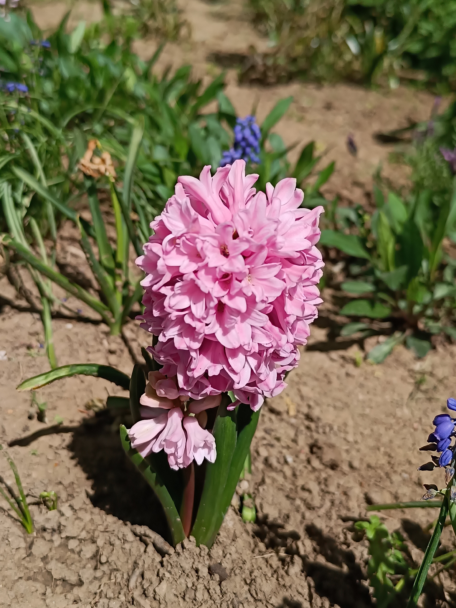 A vibrant pink hyacinth in full bloom stands as the central focus of this close-up outdoor shot, captured in a garden bed. The flower is densely packed with numerous small, star-shaped florets, displa…read more