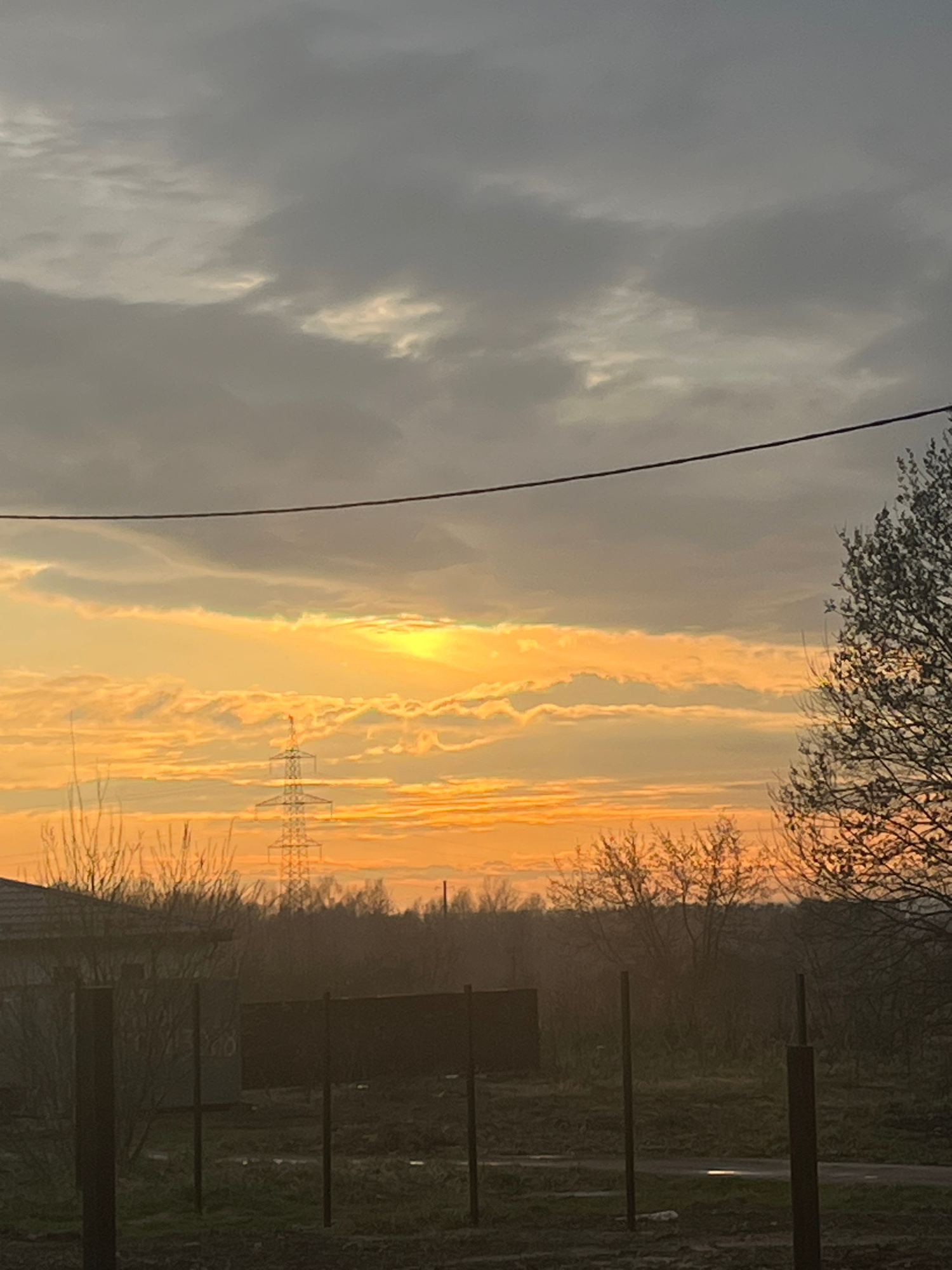 This image captures a dramatic sunset or sunrise over a rural landscape, likely in Раздолье, Russia. The sky dominates the frame, transitioning from dark, greyish clouds on the left to an intense, fie…read more