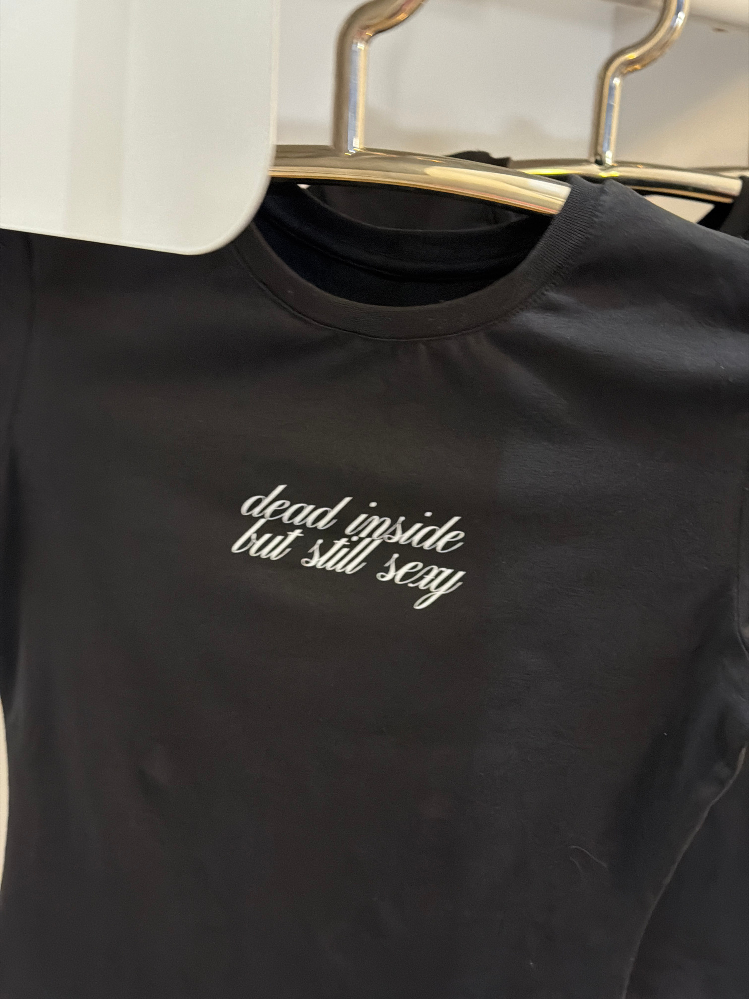 A black t-shirt hangs on a metal rack. The shirt has the white text "dead inside but still sexy" printed on it. The image is cropped, showing the top part of the shirt, and the metal rack is visible o…read more