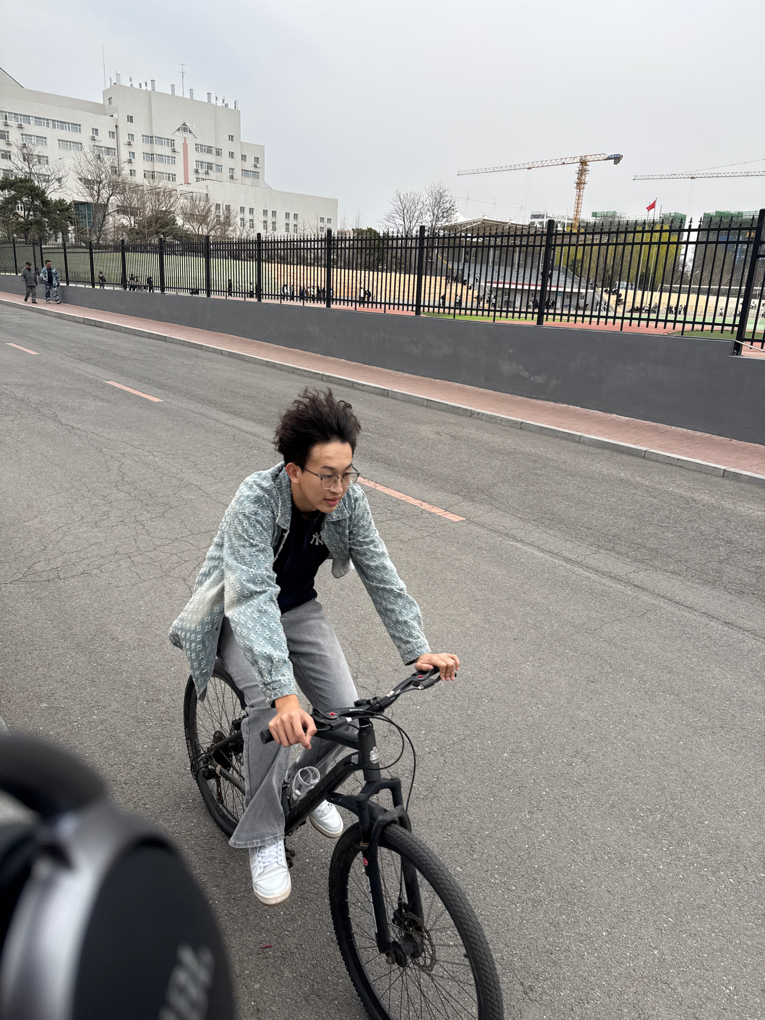 A young adult wearing glasses, a light blue jacket, a black t-shirt, and gray pants is riding a black bicycle on an asphalt road. The bike rider is facing forward with a slight turn to the left. In th…read more