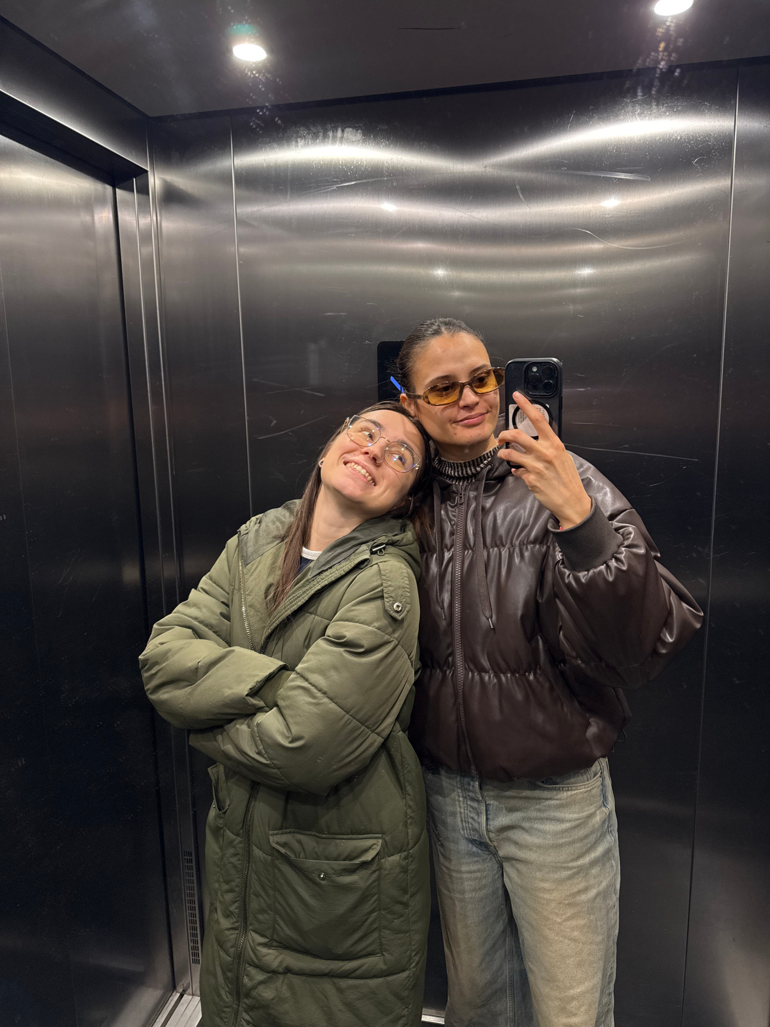 Two women are in an elevator, taking a selfie. The elevator has stainless steel walls. The woman in the top right is wearing a dark brown puffer jacket, jeans, and orange sunglasses. She is holding a…read more