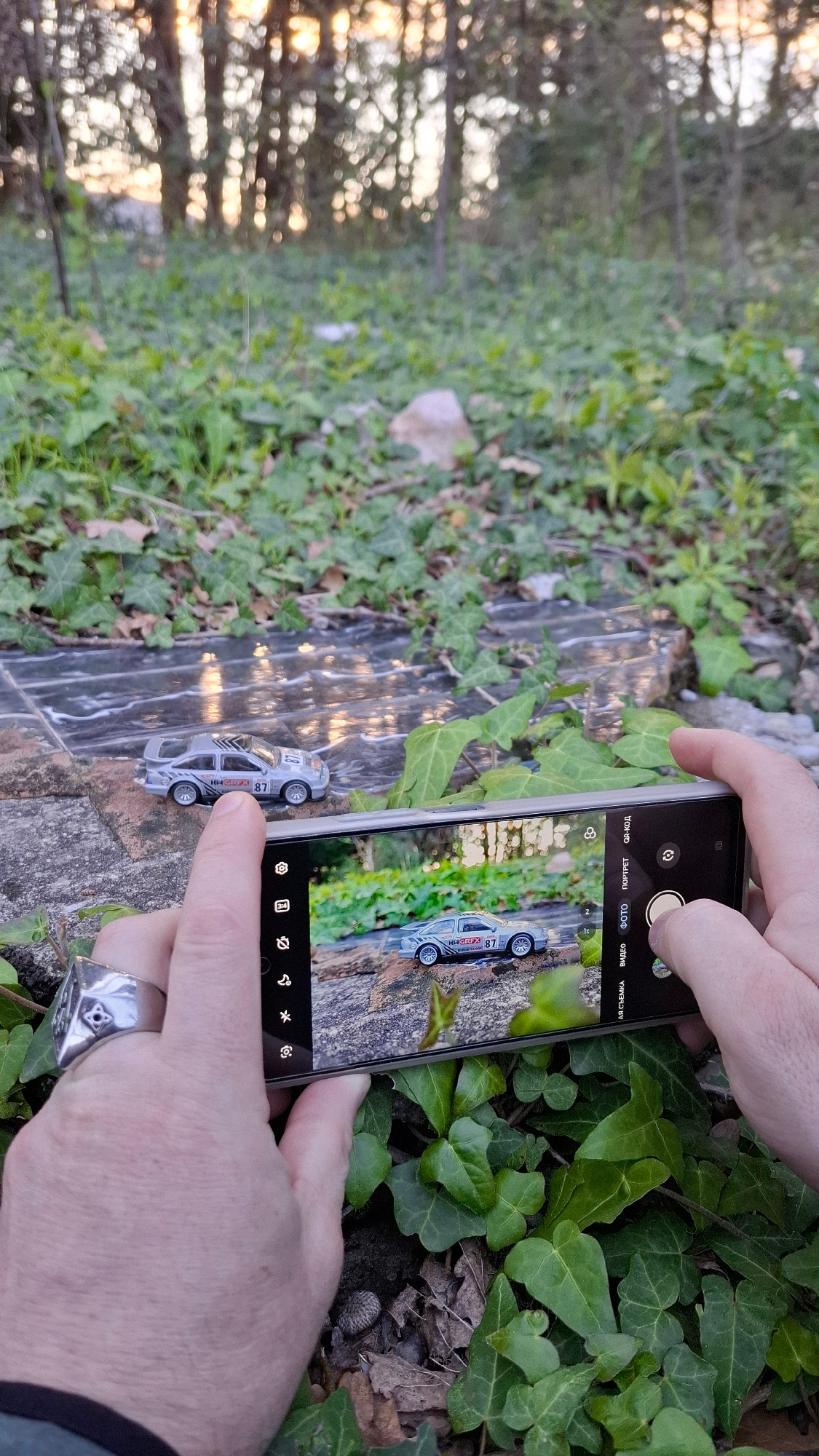 A person is taking a photo with a smartphone of a toy car. The car is silver and gray with the number "87" on its side. It is placed on a stone surface, likely part of a walkway or wall, which appears…read more