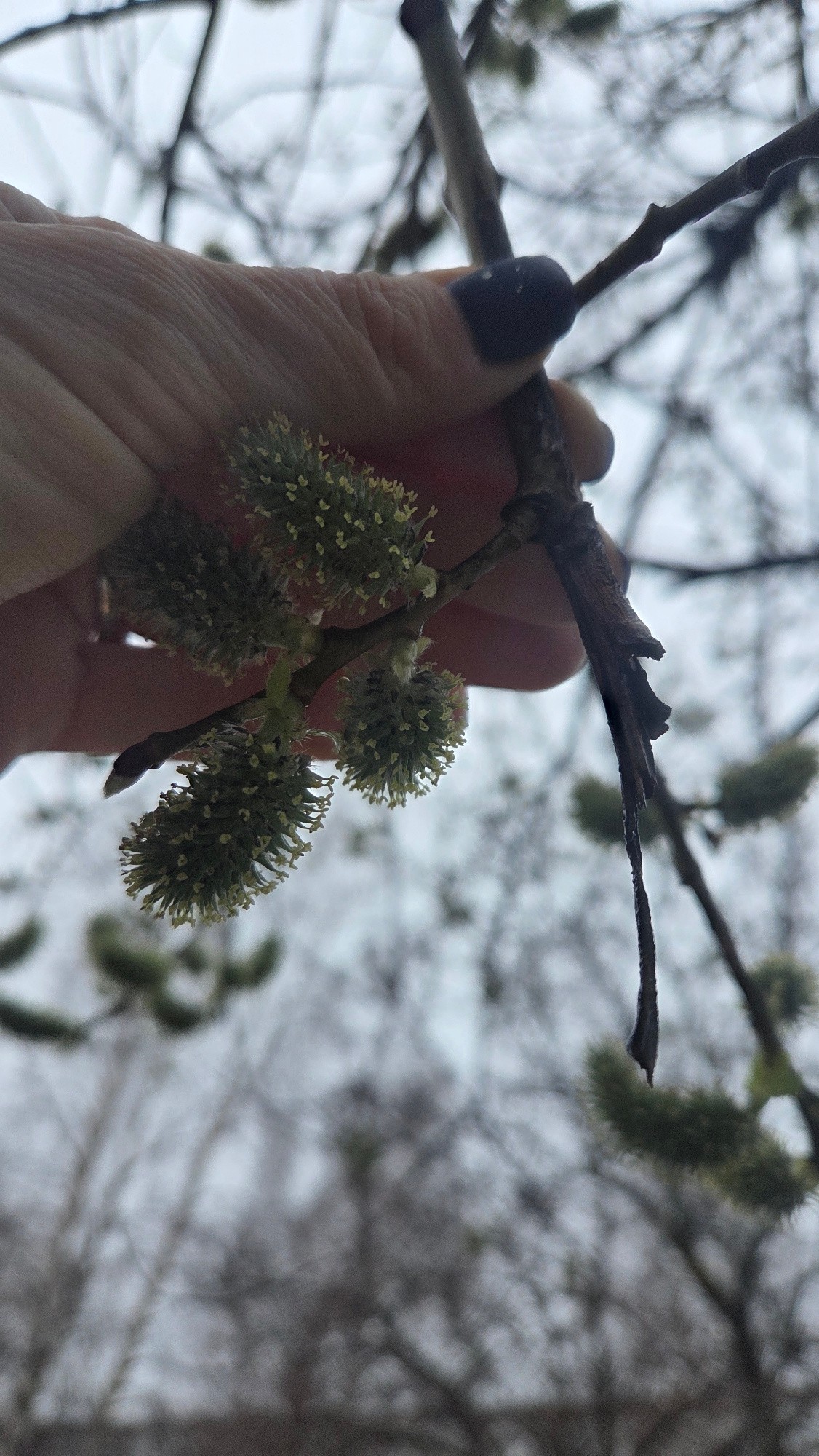 A hand with dark polished nails is holding a small branch with blossoming catkins. The background is blurred, suggesting an outdoor setting with bare trees, likely in early spring. Based on the metada…read more