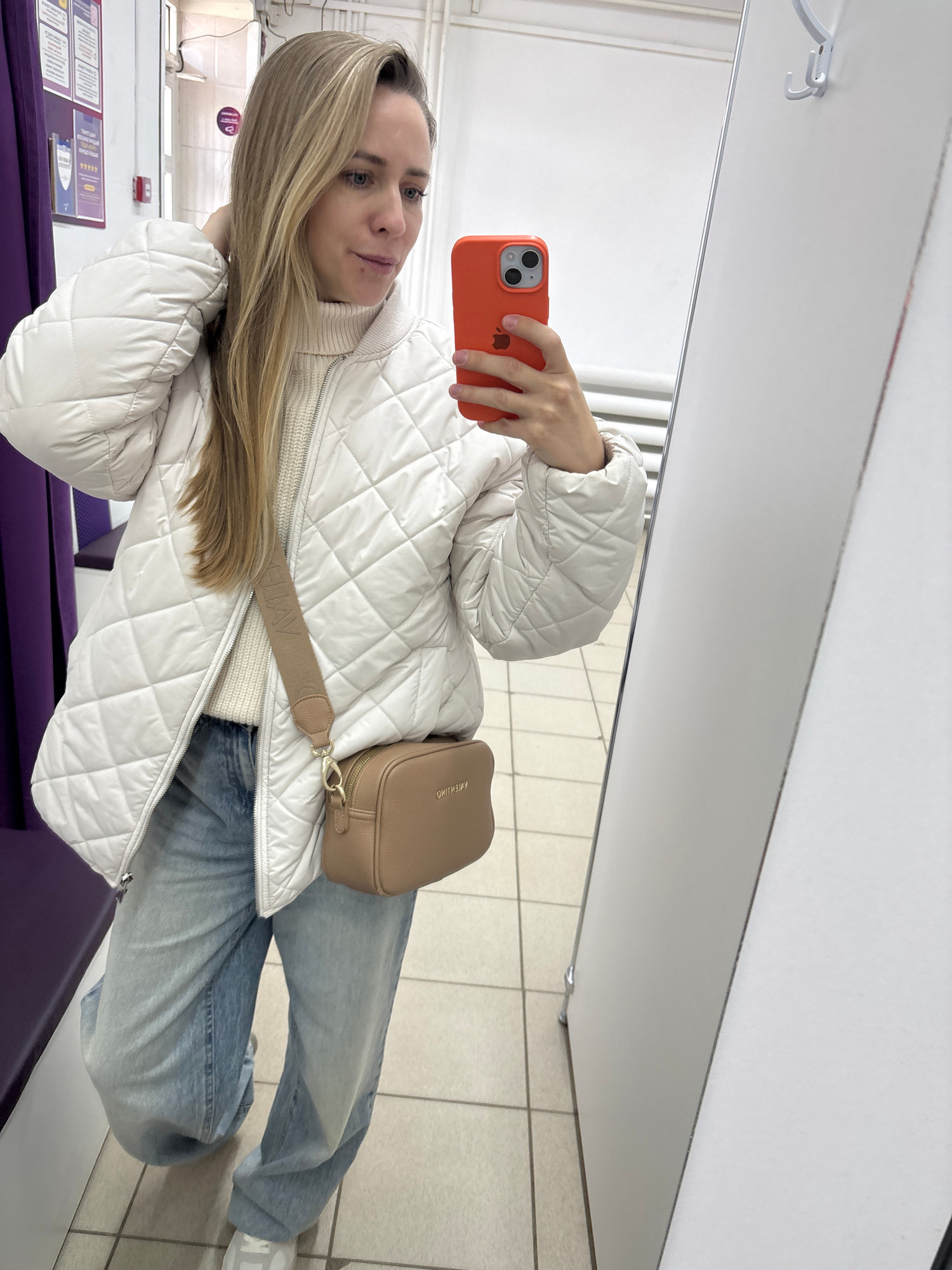 A woman is taking a selfie in a brightly lit indoor space. She is holding an orange smartphone. She's wearing a white quilted jacket over a white turtleneck sweater, and blue jeans. She has a light br…read more