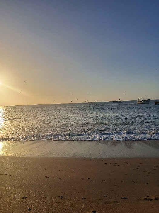 The photograph captures a serene beach scene, oriented vertically. On the right, the sand stretches upward, its surface marked with dark footprints. To the left, waves gently roll towards the shore, t…read more