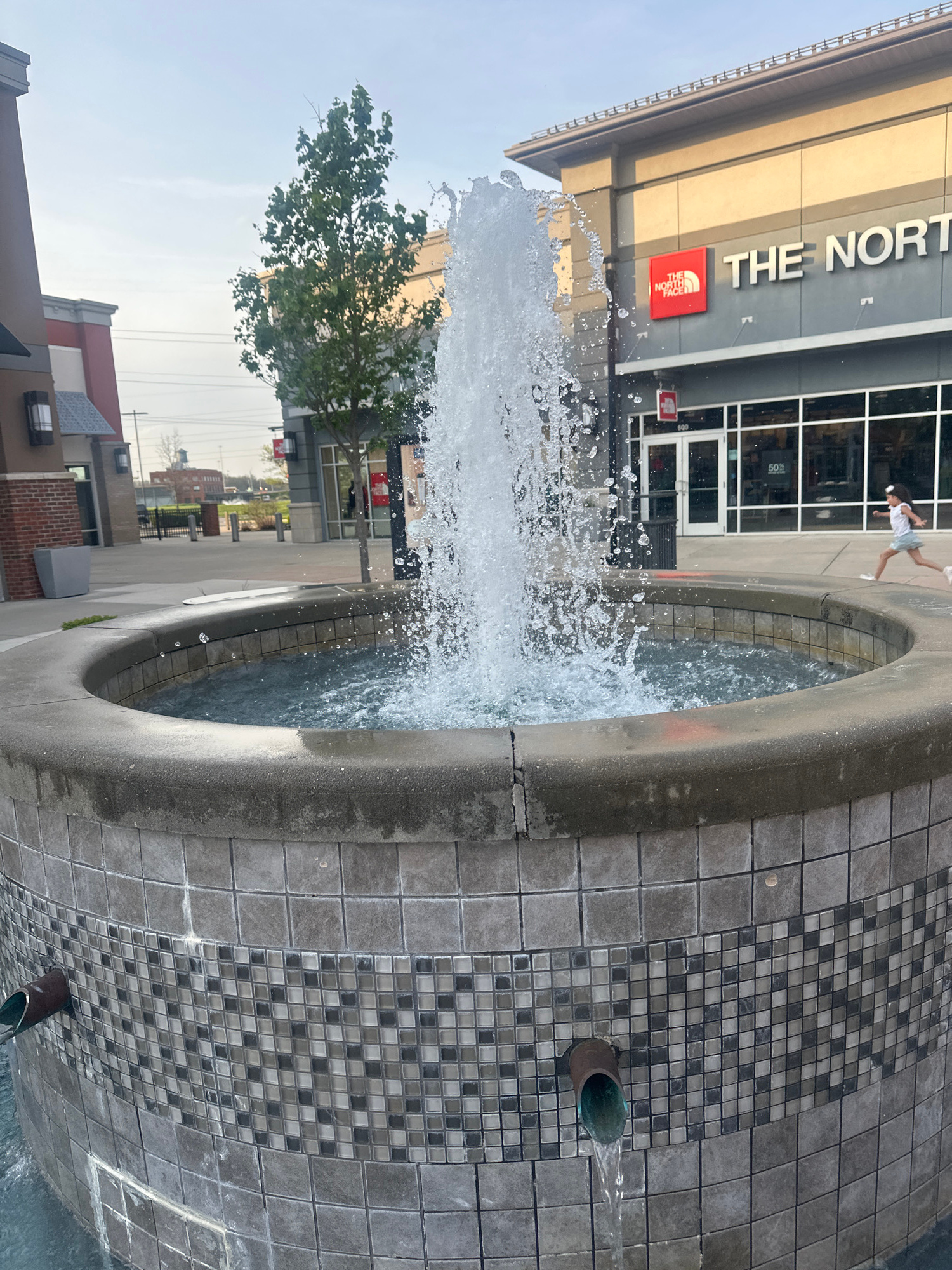 The image shows a fountain in Sunbury, United States, near a building with "THE NORTH FACE" sign. The fountain has a gray tiled base and water is shooting up from the center. A person is jumping in fr…read more