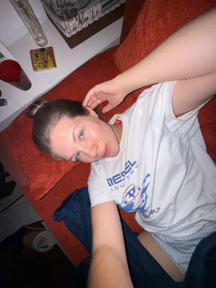 A woman lies on an orange couch. She is fair-skinned with light eyes, and her hair is pulled back in a bun. She is wearing a white t-shirt with a blue graphic. A portion of her legs, clad in striped u…read more