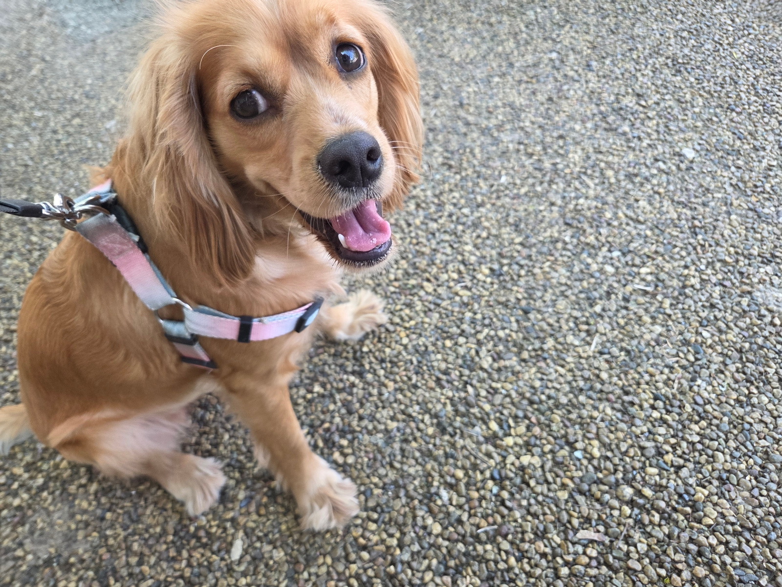 A medium close-up, eye-level shot captures a small to medium-sized dog with light brown or golden fur, sitting on a pebbled ground. The dog is positioned towards the left of the frame, looking directl…read more