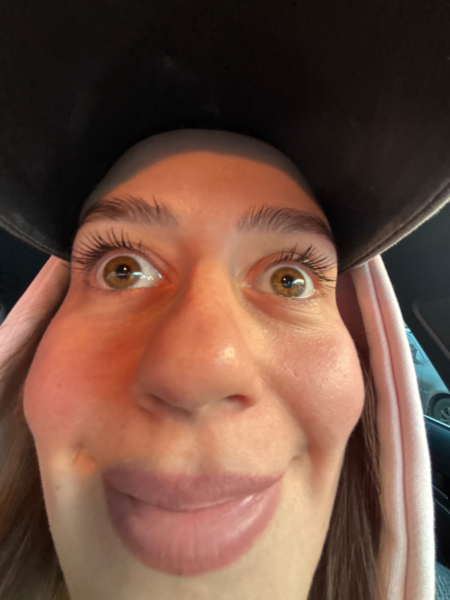 A close-up, upward-angled selfie shows a fair-skinned person wearing a black cap and a light pink hooded garment. The individual has brown eyes, prominent eyelashes, and full lips that are pursed. The…read more