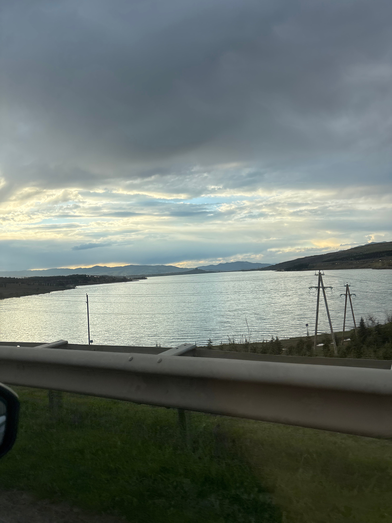 The image shows a view from a vehicle, possibly a car, looking out over a body of water, likely a lake or river. A guardrail is visible on the right side of the frame, with green vegetation extending…read more