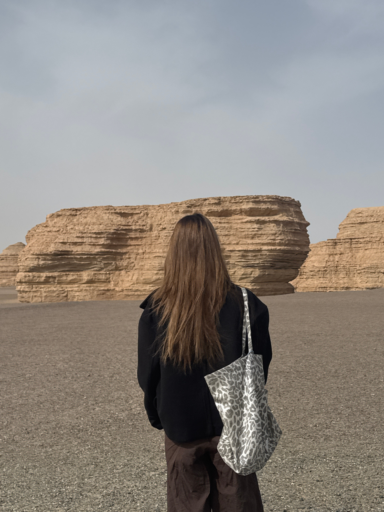 A vertical shot, rotated 90 degrees clockwise, captures a person from behind, seemingly walking or standing in an open, desert-like landscape. The individual, whose gender is not explicitly identifiab…read more