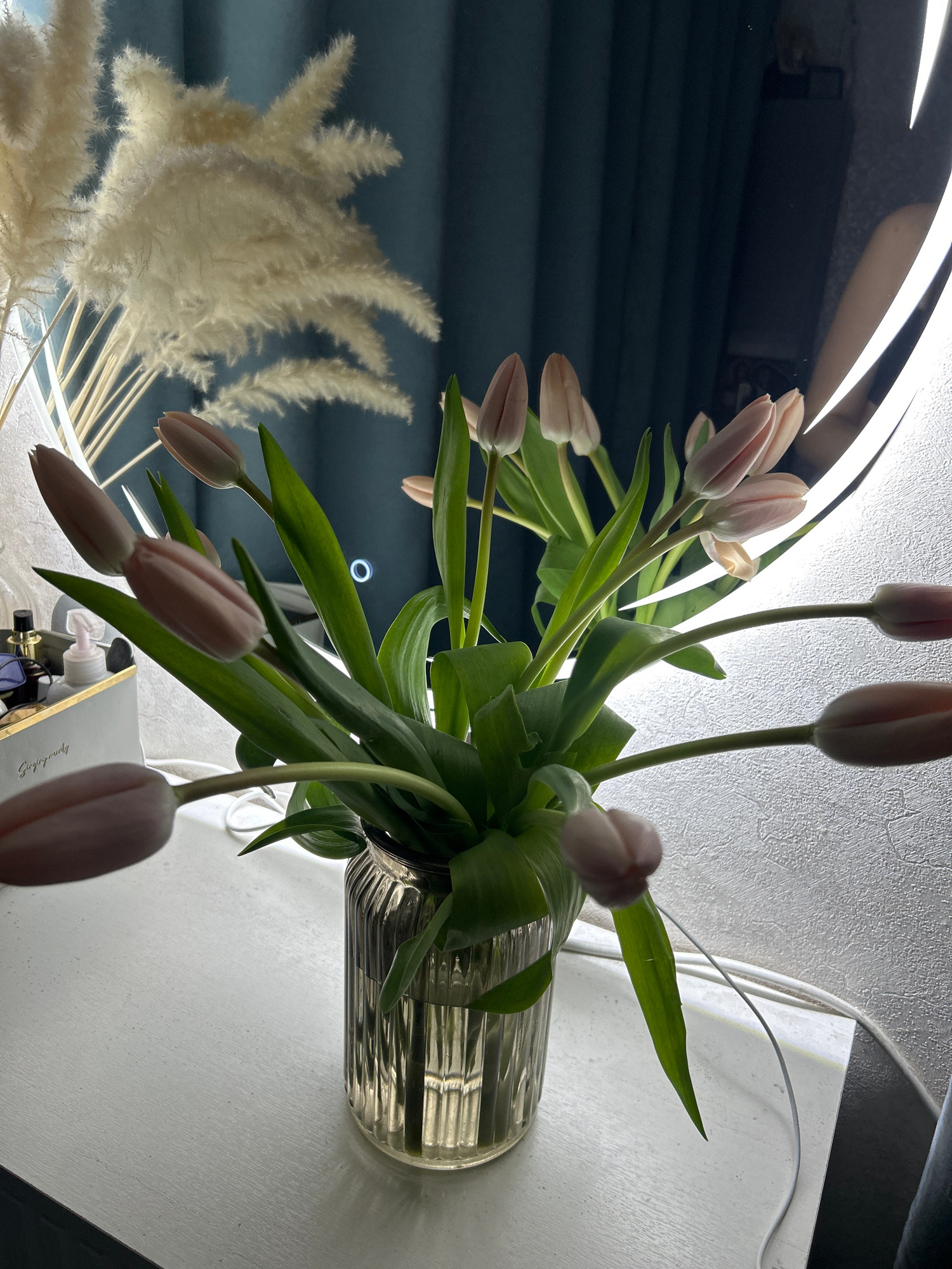 A bouquet of pink tulips in a fluted glass vase sits on a light-colored surface. The scene is illuminated by a ring light, reflected in a dark background. A pampas grass arrangement is visible in the…read more