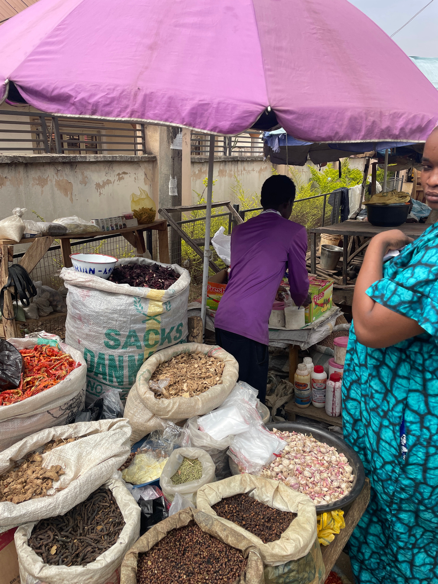 The image shows a market stall in Jos, Nigeria. A man in a purple shirt is interacting with a customer, while another person in a blue top stands nearby. The stall is covered by a pink umbrella, provi…read more