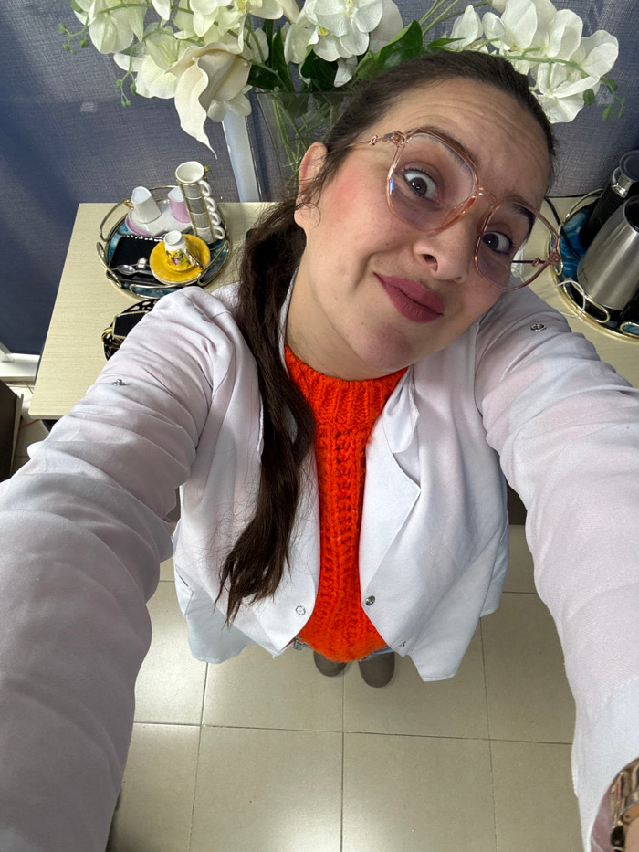 A high-angle photograph depicts a female subject in an indoor environment, identified as Meknes, Morocco. The individual is attired in a white lab coat over a vibrant orange knit sweater and wears rosβ¦read more