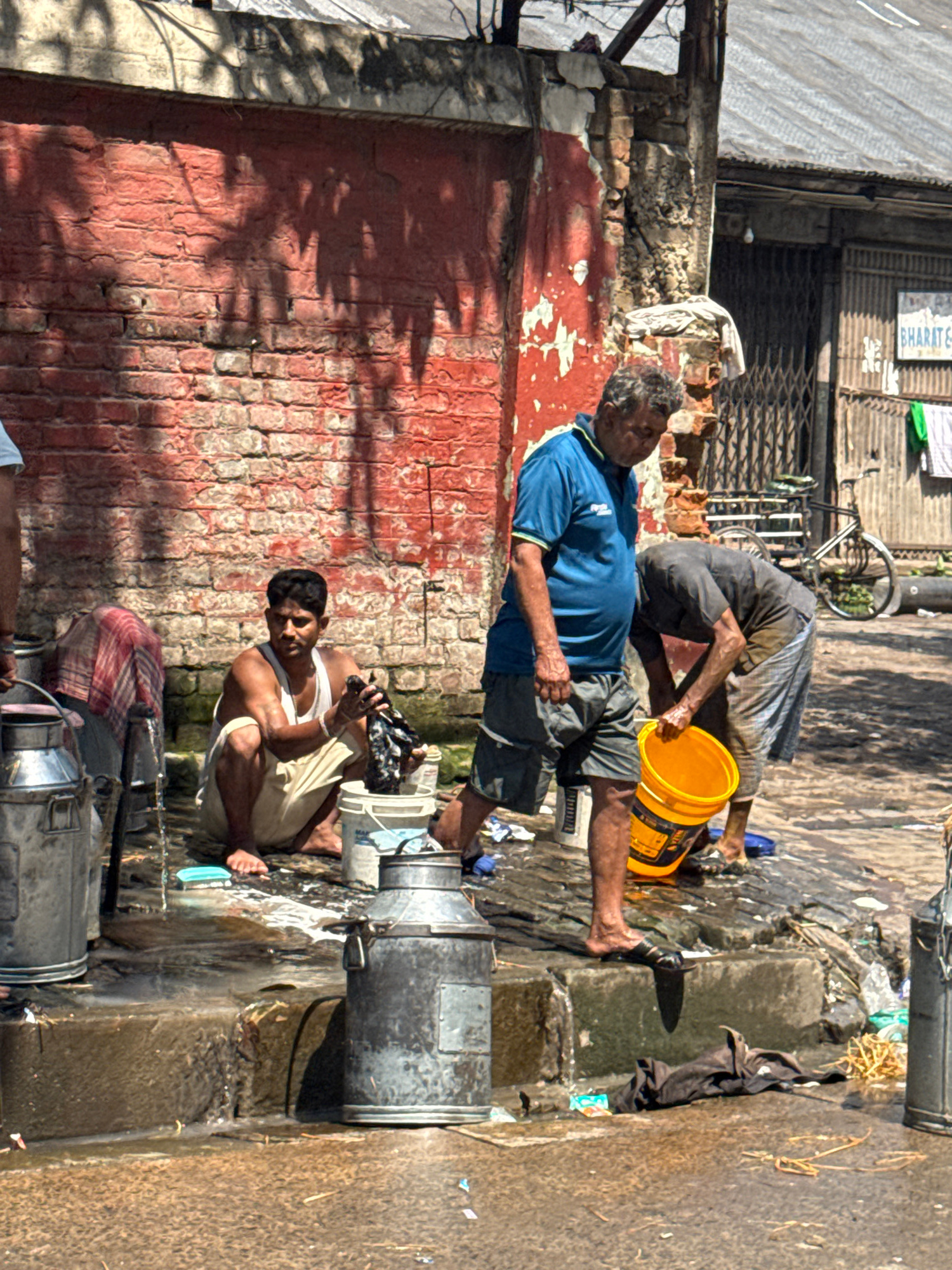 The image shows three men involved in the process of washing clothes in an urban environment, possibly in Kolkata, India. Two men are standing by a narrow concrete trench, one pouring water from a yel…read more