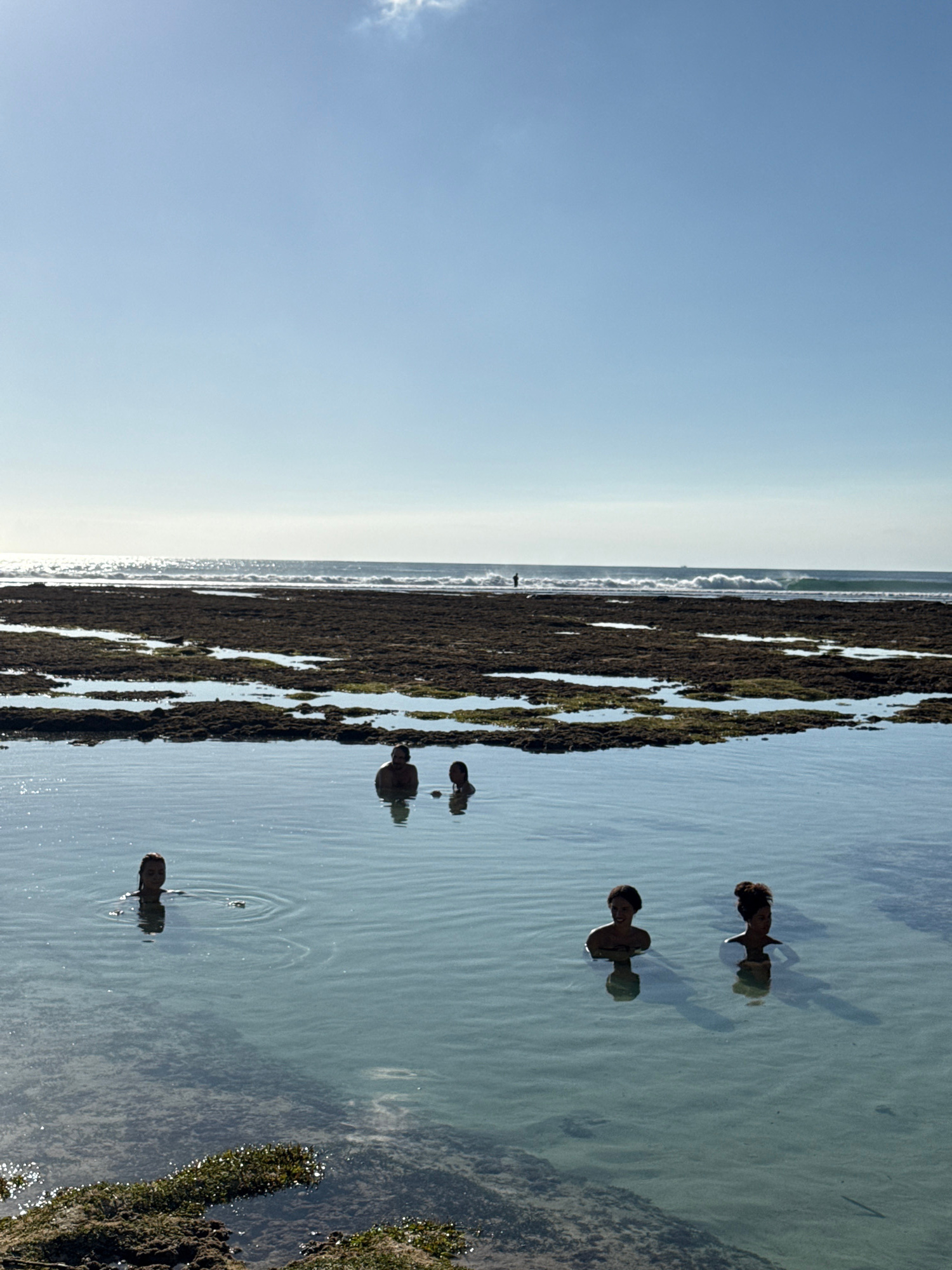 The image captures a serene coastal scene under a bright, clear sky, likely in Kuta Selatan, Indonesia. The perspective is oriented vertically, showing a wide expanse of light blue sky on the left, tr…read more